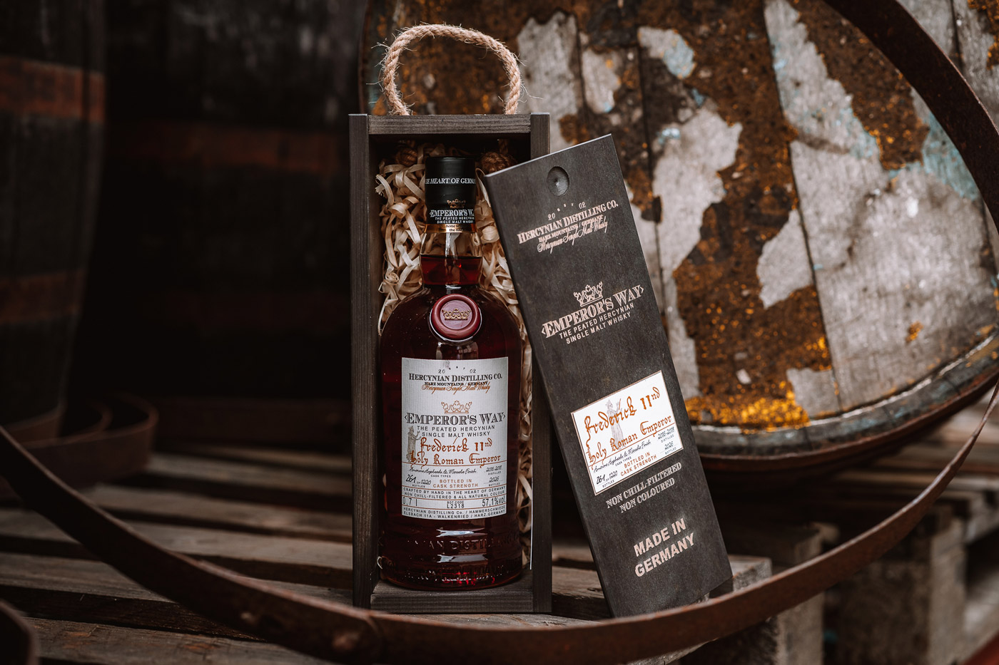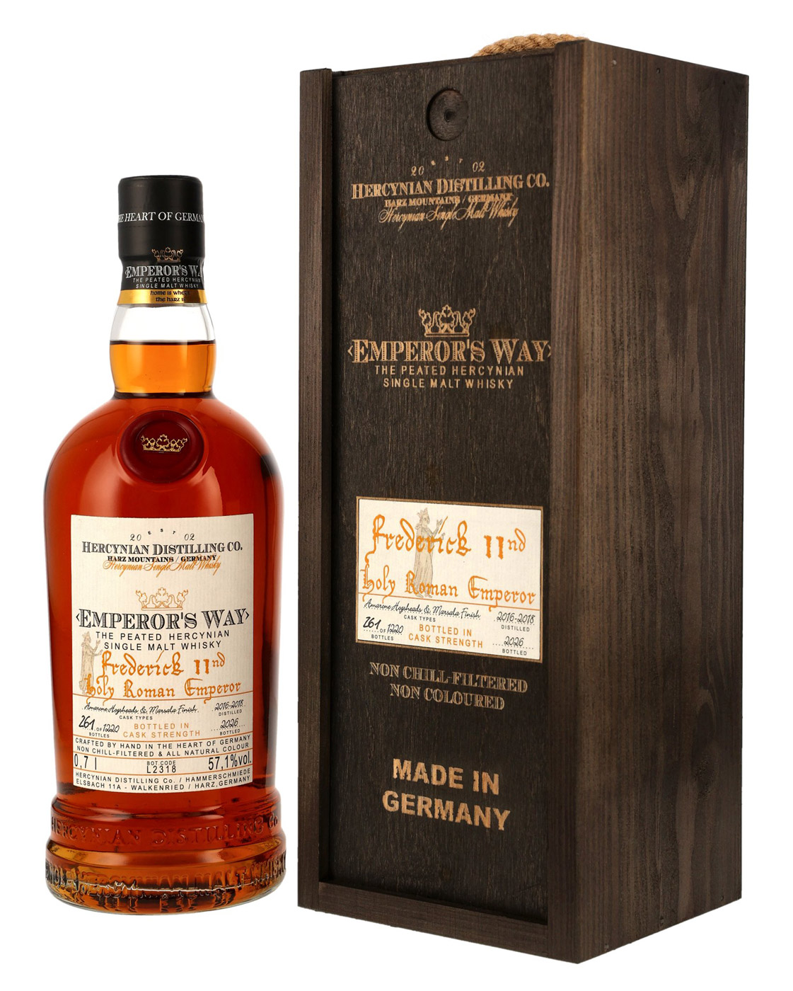 Die Hercynian Distilling Company im niedersächsischen Walkenried arrangierte für den Emperor’s Way Frederick II einen Single Malt Whisky aus getorften Destillaten aus den Jahren 2016 bis 2018. Das mittels niedersächsischen Torfs gedarrte Malz lokaler Gerste wies einen Phenolgehalt von bis zu 35 ppm auf. Bedingt der Herkunft Fredericks II aus Italien wählte die auch Hammerschmiede genannte Brennerei im Harz zunächst für die Hauptreifung Ex-Amarone-Hogsheads und dann noch für das Finish Ex-Marsala-Casks. Abgefüllt wurde erst kürzlich naturbelassen und mit einer Fassstärke von 57,1 Prozent. Die entstandene Anzahl von 1220 Flaschen à 0,7 Liter entspricht dem Jahr der Kaiserkrönung Fredericks II. Den Tasting-Notes zufolge trifft Torfrauch auf Fruchtnoten von frischen Kirschen, Zwetschgen, Trauben und Orangenzesten, Dörrobst, dunkle Schokolade, milde Kaffeenoten und „sticky toffee“.