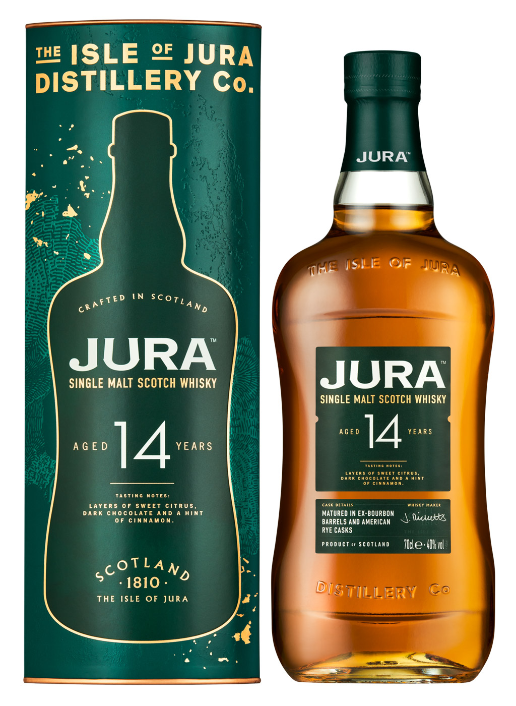 Beim Jura 14 Jahre handelt es sich um einen Single Malt Scotch Whisky, den die Jura Distillery zunächst in Ex-Bourbon-Barrels reifen lässt. Zu einem unbekannten Zeitraum erfolgte die Umlagerung in Ex-American-Rye-Casks. Nach alles in allem 14 Jahren der Reifung wird mit einem Alkoholvolumen von 40 Prozent abgefüllt. Offizielle Angaben, wie es mit einer Kältefiltration und einer Färbung aussieht, fehlen. Die Tasting-Notes versprechen Ebenen süßen Zitrus und dunkler Schokolade sowie einen Hauch Zimt.
