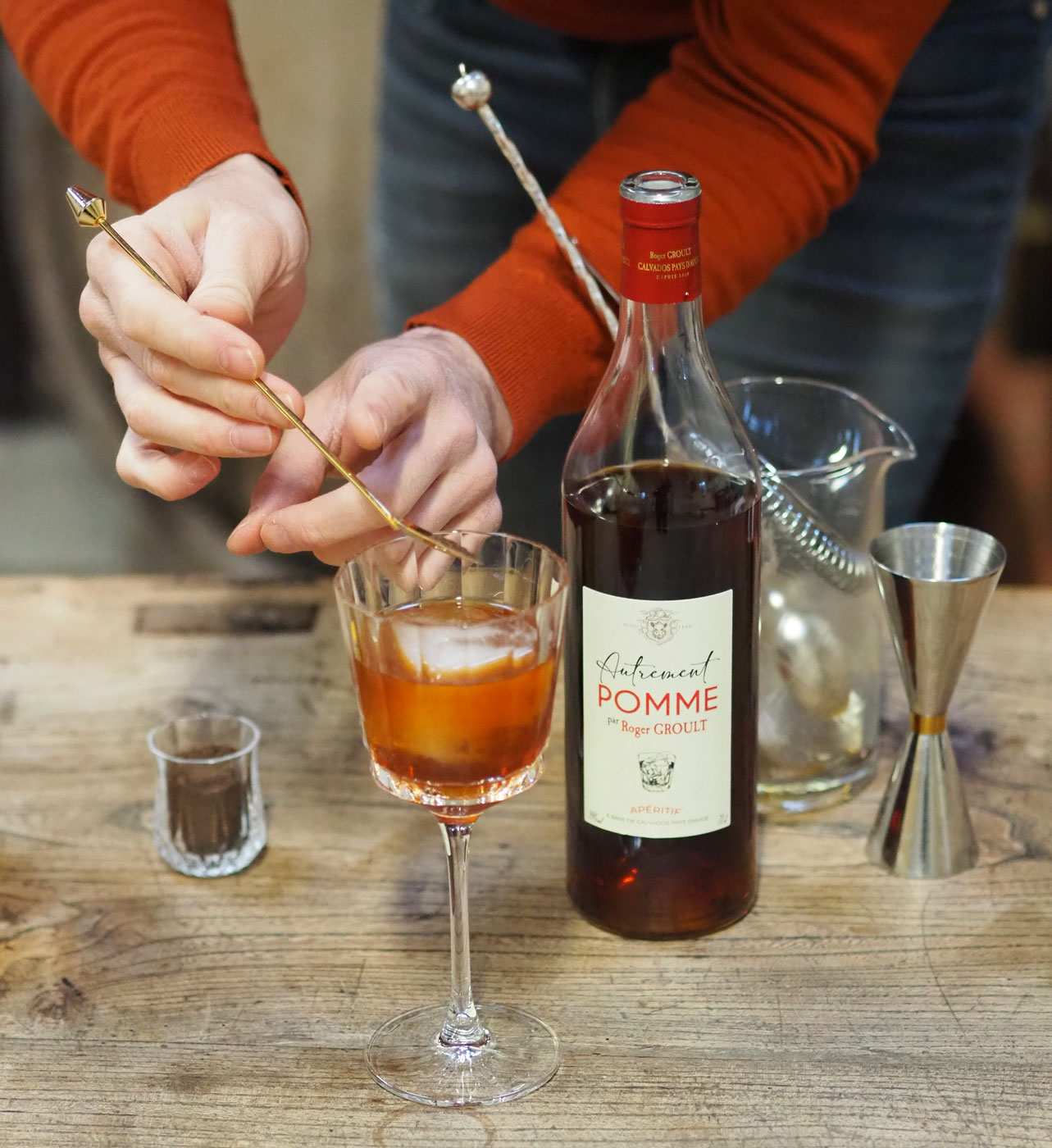Pommeau ist ein vergleichsweise junger Apfelaperitif, der aus der Vermählung von Apfelsaft (Most) und jungem Calvados (oder anderem Apfelbrand) entsteht. Dieses Verfahren nennt sich „Mutage“: der Alkohol stoppt die Gärung des Safts, wodurch die natürliche Süße erhalten bleibt.
