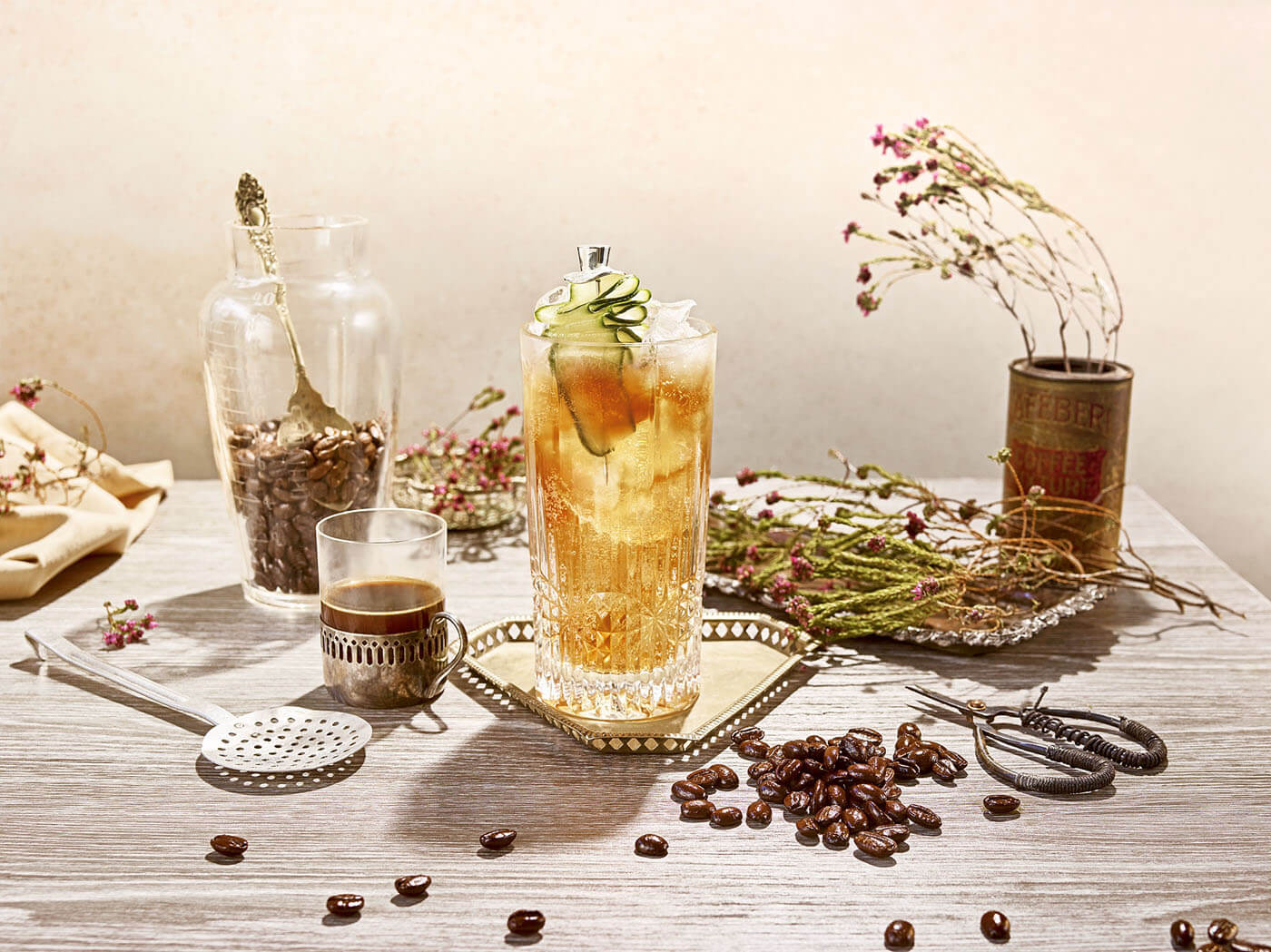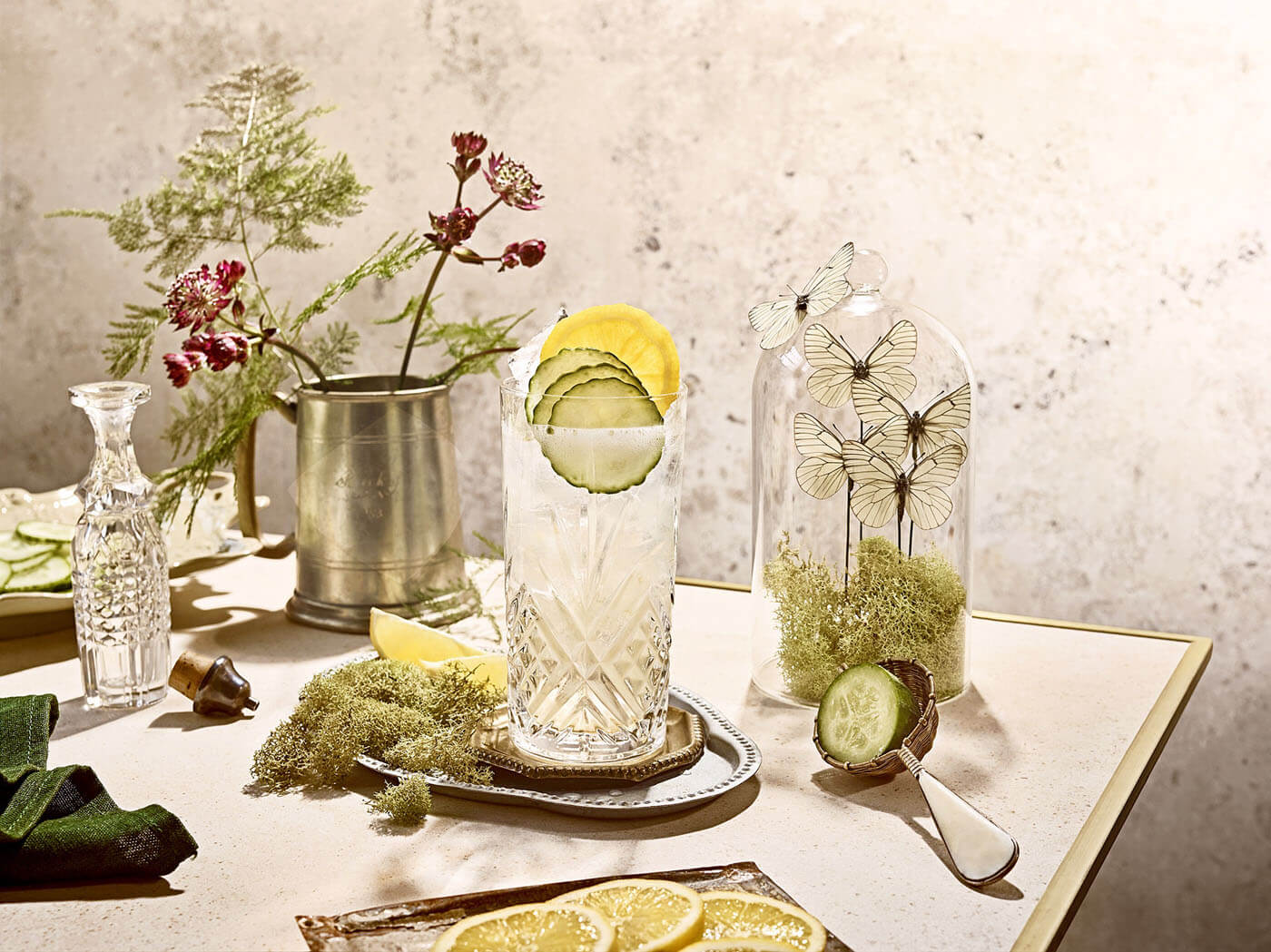 Zubereitung: Alle Zutaten in einem Longdrink Glas mit Eiswürfel vermischen, leicht verrühren und servieren. Garnieren mit drei dünn geschnittenen Gurkenscheiben.