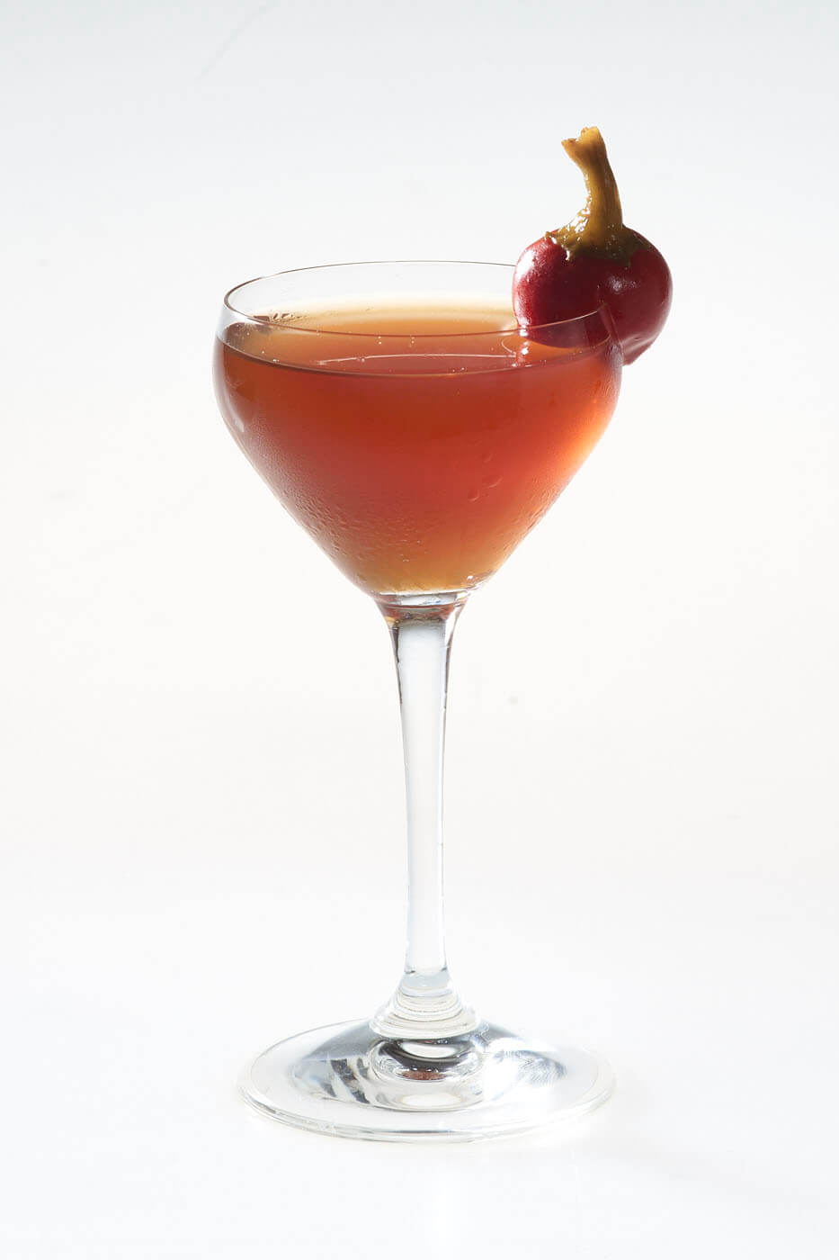 Zubereitung: Alle Zutaten im Rührglas auf Eiswürfeln gründlich kaltrühren. Ins vorgekühlte Glas abseihen. Mit einer Kirschpfefferone garnieren.