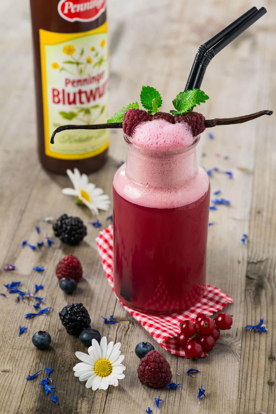 Dass traditionelle Spirituosen keinen Platz in modernen Cocktails haben, wird immer wieder widerlegt. Ein Beispiel dafür ist der Penninger Blutwurz. Für den bayerischen Kräuterlikör – und auch die Penninger Blutwurz Red genannte Variante mit Kirschen – gibt es gleich eine ganze Kollektion mit unterschiedlichen Drinkrezepten, die in Kooperationen mit professionellen Bartendern entstanden sind.
