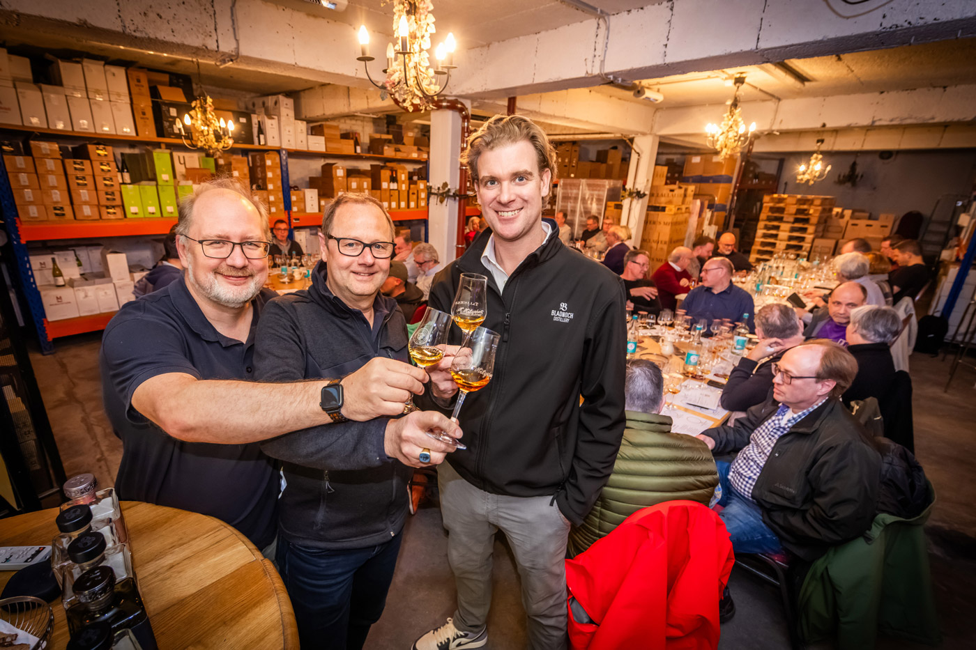 das Foto zeigt Menschen in einer Halle. Zur Kamera gerichtet sind drei Männer, die mit Gläsern anstoßen