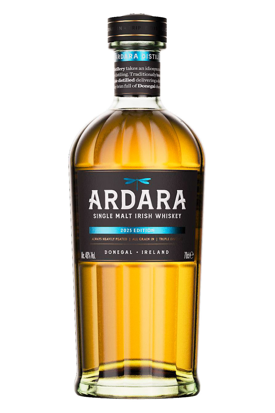 Gleich zu Beginn soll die Ardara Single Malt Irish Whiskey 2025 Edition den sogenannten „Donegal Style“ widerspiegeln. Nach historischem Vorbild, so die Gründer der Ardara Distillery, wird auf stark getorftes Gerstenmalz – der Phenolgehalt liegt bei 55 ppm – gesetzt. Außerdem wird das Malz mittels ein Hammermühle gemahlen und die Maische nicht geläutert. Destilliert wird dreifach auf Kupferbrennblasen. Die 2025 Edition startete ihre Reifung in einem sogenannten Solera Vat, einem Bottich, der für Kontinuität zwischen den Batches sorgen soll. Des Weiteren ist die Rede von Ex-Sherry-, Ex-Bourbon- und Virgin-Oak-Casks. Eine Altersangabe existiert nicht. Abgefüllt wurde mit einem Alkoholvolumen von 46 Prozent, ohne Kältefiltration und ohne Farbstoff. Es entstanden 7000 Flaschen à 0,7 Liter.