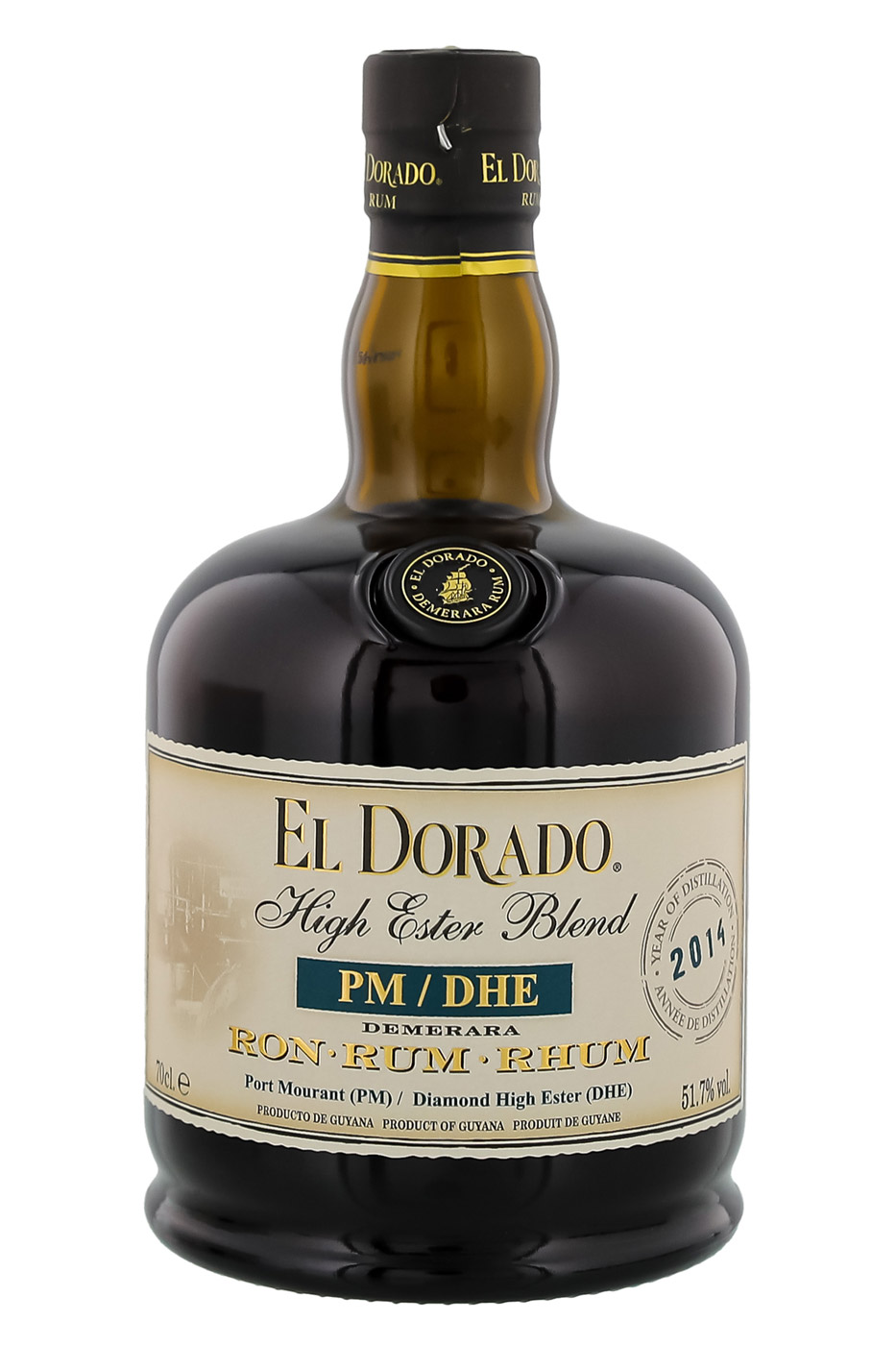 Beim El Dorado High Ester Blend 2014 PM/DHE handelt es sich um die Nummer zwei der High Ester Blend Series. In dem Blend befinden sich im Jahr 2014 aus Zuckerrohrmelasse gewonnene Rums der Marks PM und DHE. Auf den Diamond High Ester Rum, welcher vergleichbar mit dem im El Dorado High Ester Blend 2012 LBI/DHE sein soll, stößt ein Rum des Marks PM, stehend für Port Mourant und damit für die Double Wooden Pot Still der Diamond Distillery. Ihre zehn Jahre langen Reifungen erfolgten in Ex-Bourbon-Casks im tropischen Klima. Im Anschluss an die Vermählung wurde mit einem Alkoholgehalt von 51,7 Prozent abgefüllt. Bezüglich etwaiger Zusätze ist nichts bekannt. Der finale Estergehalt beträgt 380 Gramm pro Hektoliter reinen Alkohols. Wie viele Flaschen gewonnen werden konnten, verbleibt im Dunkeln.
