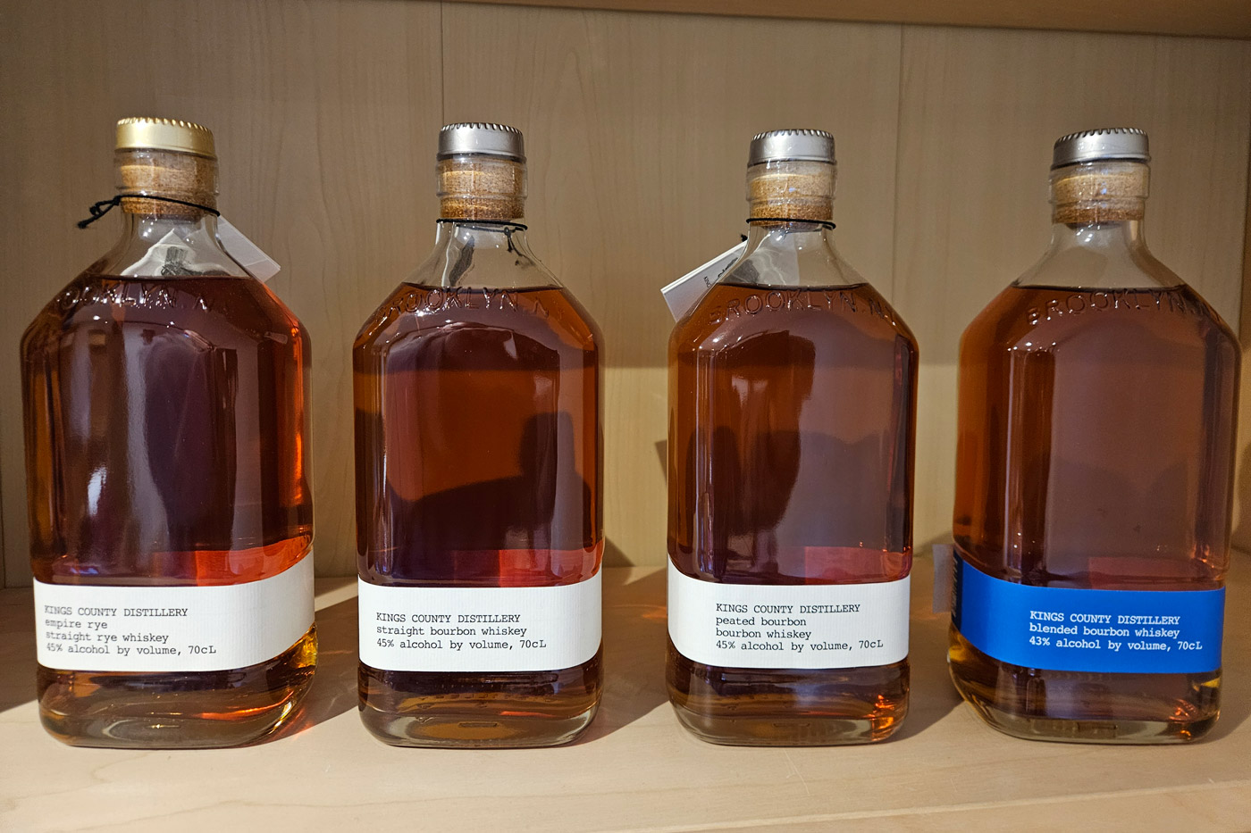 Angeführt wird das Sortiment der Kings County Distillery vom Kings County Straight Bourbon Whiskey. Dessen Mashbill setzt sich aus 80 Prozent New Yorker Bio-Mais und 20 Prozent Malz englischer Golden Promise Gerste zusammen. Die Reifung erstreckt sich über drei bis sieben Jahre. Abgefüllt wird mit einem Alkoholvolumen von 45 Prozent.