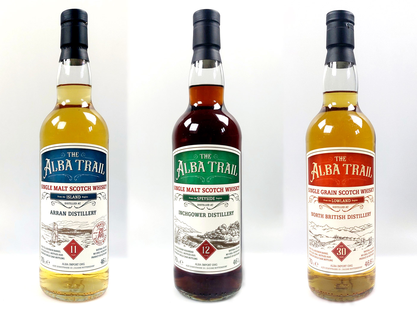 Das neue Trio des The Alba Trail 10.0 ist seit diesem Monat im gut sortierten Fachhandel anzutreffen. Die unverbindlichen Preisempfehlung liegen bei 82 Euro für die 0,7-l-Flasche des Arran 2013/2025, bei 69 Euro für die 0,7-l-Flasche des Inchgower 2013/2025 und bei 129 Euro für die 0,7-l-Flasche des North British 1994/2025.