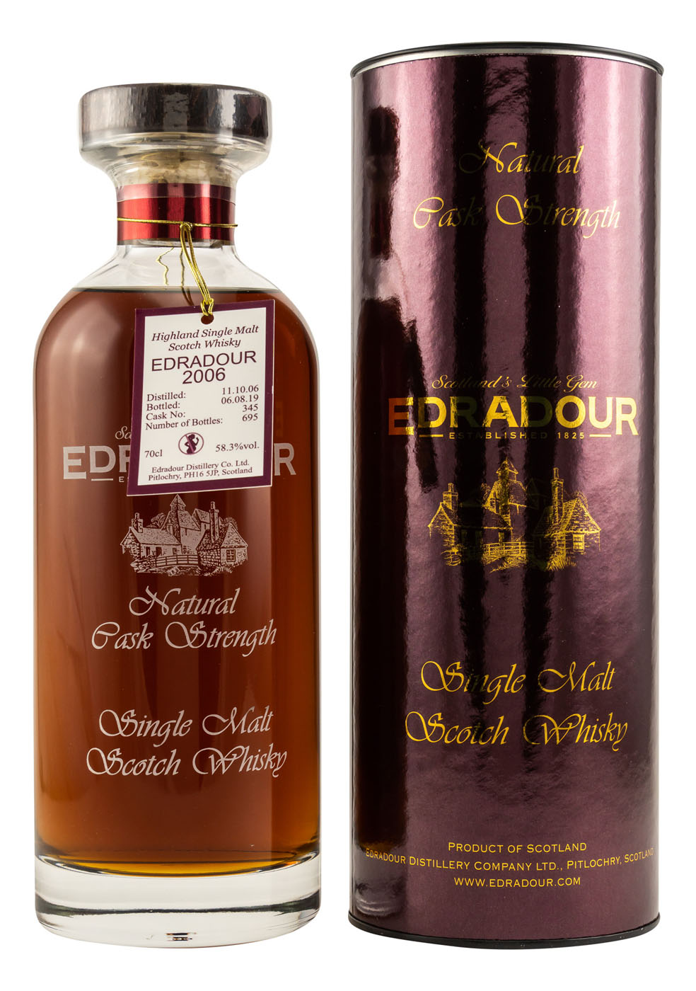 In unregelmäßigen Abständen lanciert die in den schottischen Highlands beheimatete Edradour Distillery ausgewählte Single Casks, Vintages und Cask Strength Editionen. Auch jetzt zum Vorweihnachtsgeschäft 2019 haben vier solcher Abfüllungen die Brennerei verlassen. Bestandteil des neuen Aufgebots ist auch ein neues Batch des Edradour Natural Cask Strength im Ibisco-Dekanter. Der am 11. Oktober 2006 gebrannte Single Malt Whisky verbrachte bis zum 6. August 2019 rund zwölf Jahre in einem Ex-Sherryfass mit der Nummer 345. Bei einer Fassstärke von 58,3 Prozent, ohne Filtration und ohne Farbstoff konnten 695 Flaschen gewonnen werden.