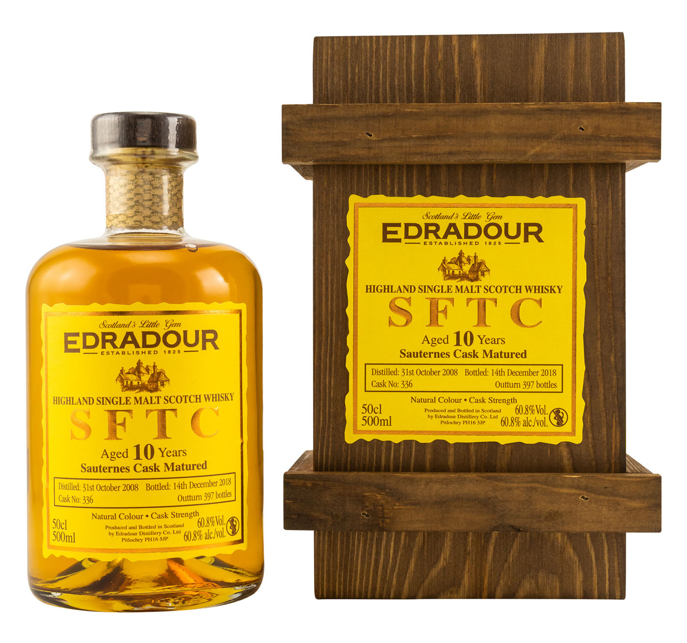 Komplettiert wird das Aufgebot vom Edradour SFTC 2008/2018 Sauternes Cask Matured. Der Single Malt Whisky der “Straight From The Cask”-Collection wurde am 31. Oktober 2008 destilliert und bis zum 14. Dezember 2018 rund zehn Jahre in einem Ex-Sauternes-Süßweinfass gereift. Aus dem Fass mit der Nummer 336 konnten 397 Flaschen bei einer Fassstärke von 60,8 Prozent, ohne Kältefiltration und ohne Farbstoff abgefüllt werden.