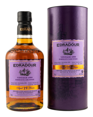 Für den Edradour Vintage 1999/2019 Bordeaux Cask Finish wurden die beiden Fässer 814 und 815 geöffnet. Nach der Destillation frühestens am 12. Oktober 1999 erfolgte zunächst eine 13-jährige Reifung in Ex-Bourbon-Hogsheads, gefolgt von weiteren sechs Jahren in Ex-Premier-Grand-Cru-Bordeaux-Hogsheads. Am 22. Juli 2019 konnten 589 Flaschen bei einer Fassstärke von 56,2 Prozent, unfiltriert und ungefärbt entnommen werden.