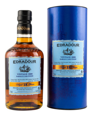 Mit dem Edradour Vintage 2000/2019 Barolo Cask Finish gab die Brennerei eine Abfüllung aus den beiden Fässern 805 und 808 frei. Der 18-jährige Single Malt Whisky wurde frühestens am 28. November 2000 destilliert und am 22. Juli 2019 abgefüllt. Die ersten zwölf Jahre der Reifung fanden in Ex-Bourbon-Hogsheads statt, während das sechsjährige Finish in Ex-Barolo-Wine-Hogsheads erfolgte. Das Abfüllen in Flaschen geschah mit einer Fassstärke von 56,5 Prozent, ohne Kältefiltration und ohne Farbstoff. Es entstanden 578 Flaschen.
