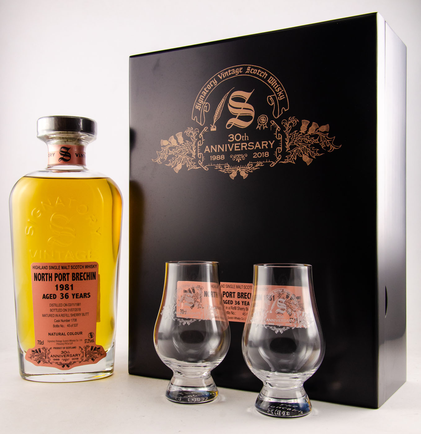 Aus der North Port Distillery in den schottischen Highlands stammt der im Jahr 1981 gebrannte Single Malt Whisky, der bis vor Kurzem noch in dem Refill-Sherry-Butt mit der Nummer 1708 reifte. Nach 36 Jahren der Reifung holte Signatory Vintage die Menge für 537 aus dem Fass. Das Ganze geschah naturbelassen mit einer Fassstärke von 57,2 Prozent.