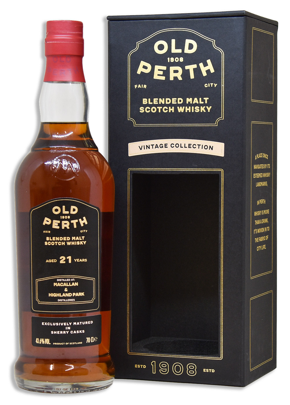 Der Old Perth 21 Jahre, ebenfalls ein Blended Malt Scotch Whisky, wurde im Jahr 2015 aus einem über zehn Jahre alten Single Malt der Highland Park Distillery auf den schottischen Orkney Inseln und einem „weitaus“ älteren Single Malt der The Macallan Distillery in der schottischen Speyside vermählt. Es folgte eine zehn Jahre lange Nachreifung in Ex-Oloroso-Sherry-Butts. Nach alles in allem 21-jähriger Reifezeit nahmen die Morrison Scotch Whisky Distillers das Abfüllen mit einem Alkoholvolumen von 43,6 Prozent, nicht kältegefiltert und nicht gefärbt vor. Es entstanden 900 Flaschen à 0,7 Liter.