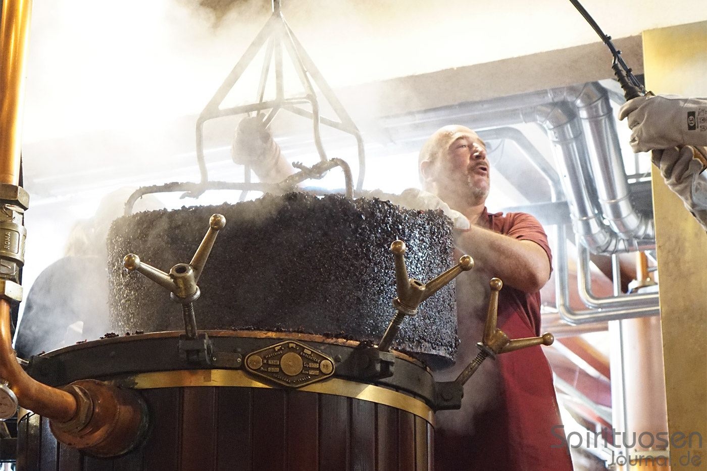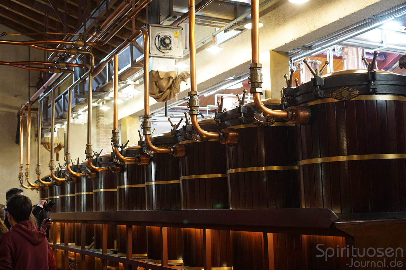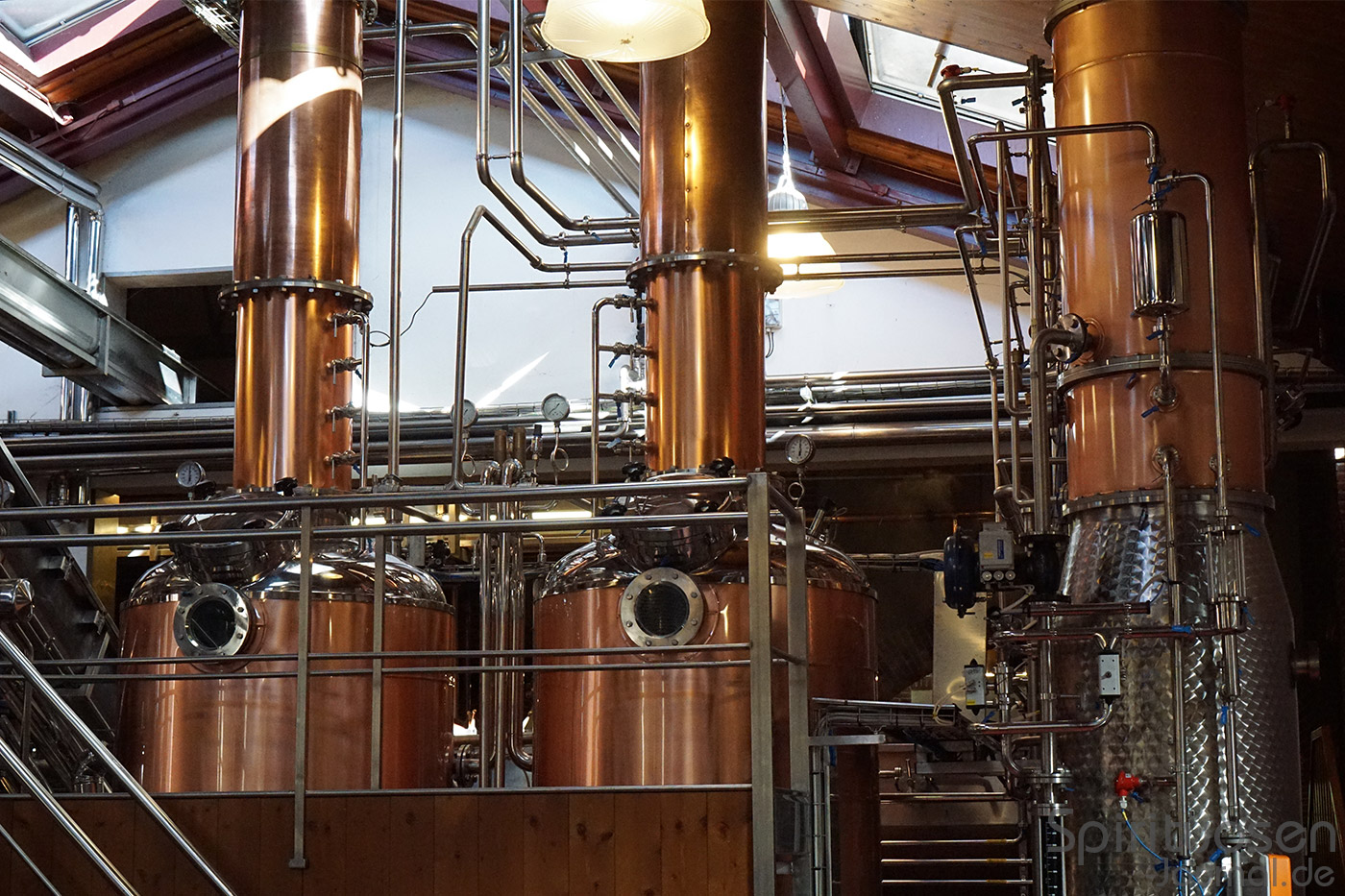 Die kupfernen Kessel werden mit Dampf betrieben, der durch den in Kupferkörben platzierten Trester wandert. Angeschlossen sind die Kessel an drei Kolonnen mit neun Glockenböden.
