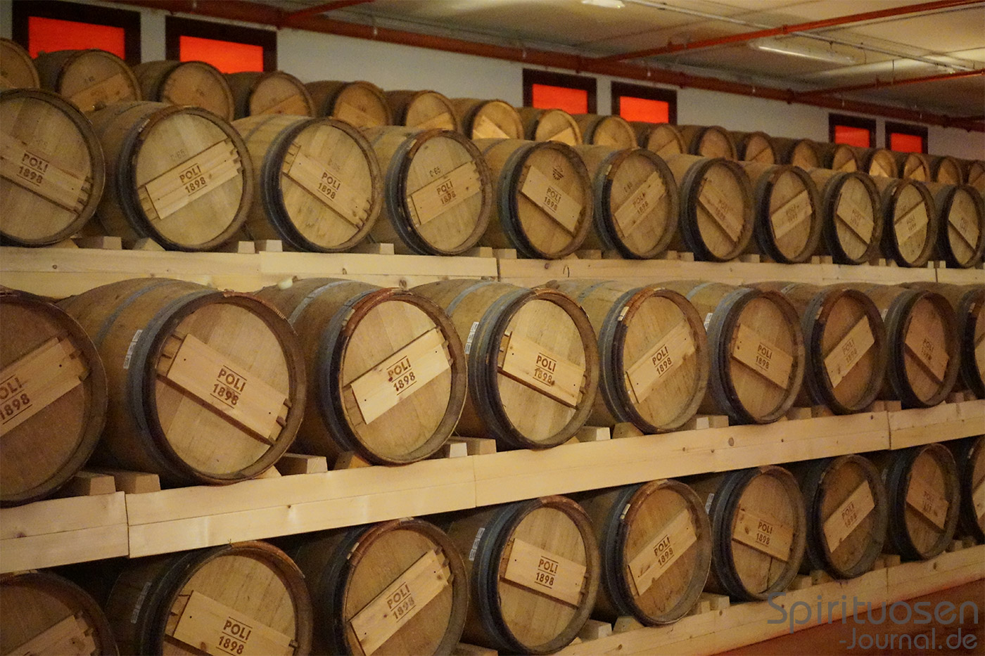 Was die Reifung anbelangt, verfügt die Poli Distillerie über weitläufige Reifekeller, in denen permanent rund 4000 Fässer ruhen sollen.