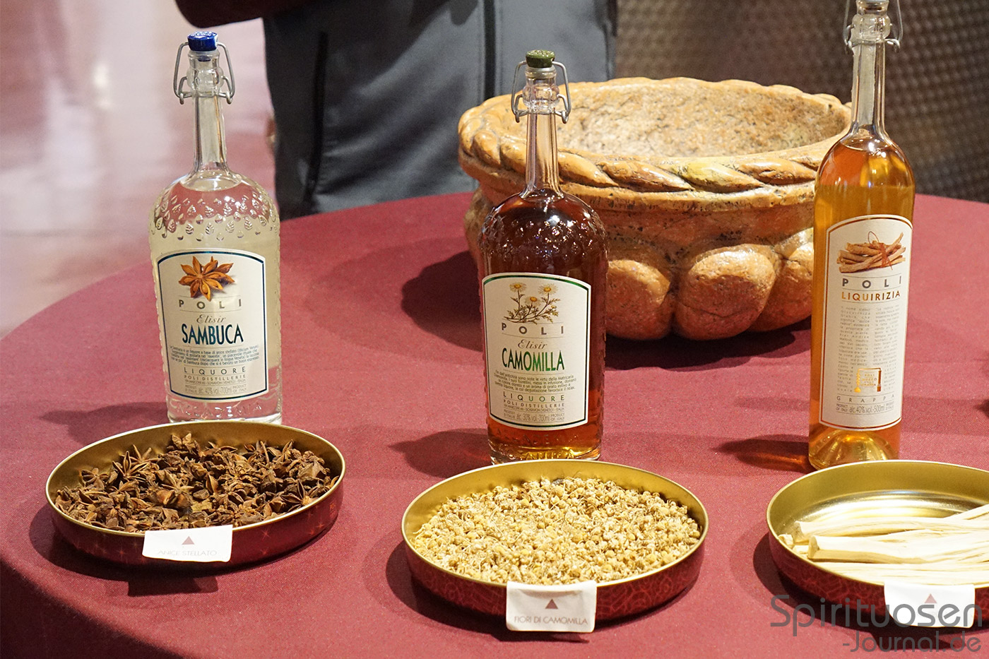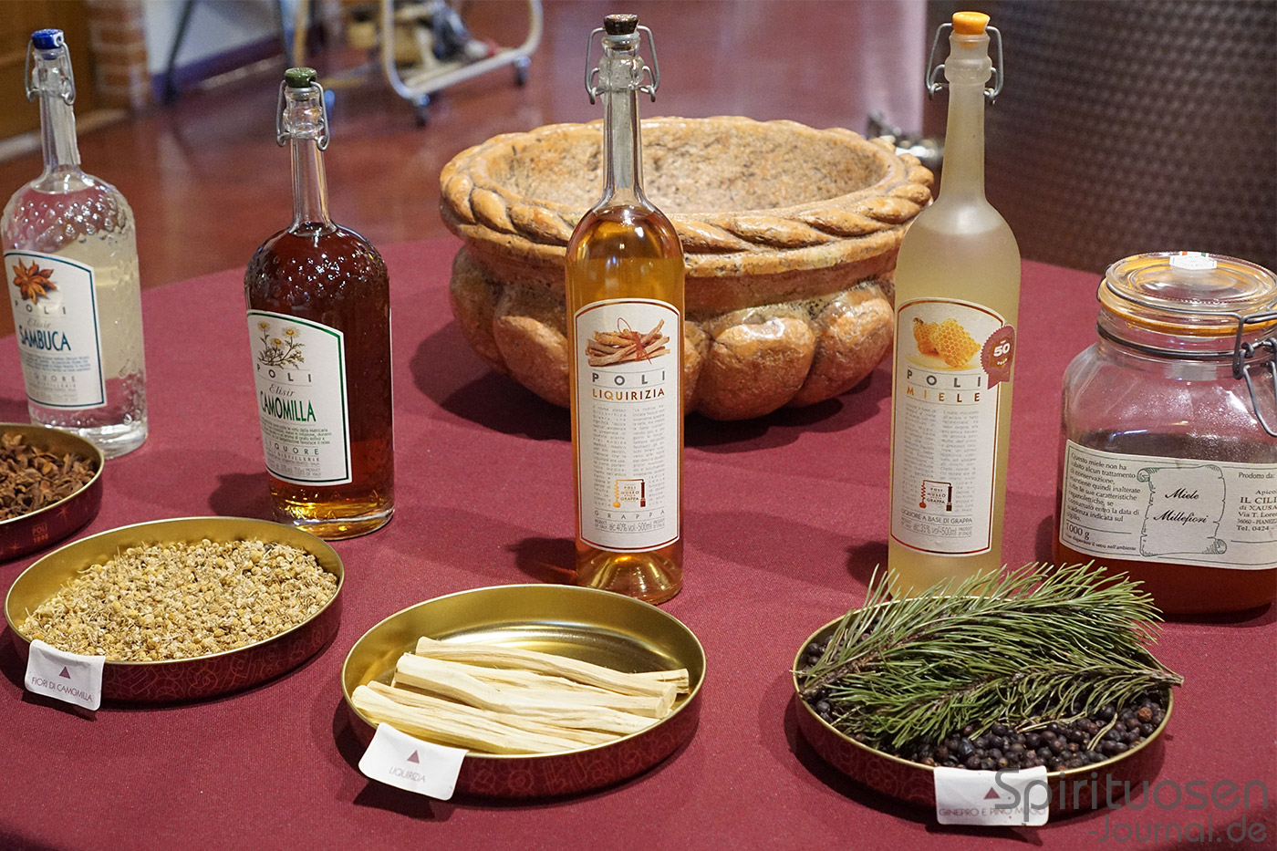 Ihren hauseigenen Grappa nutzt die Poli Distillerie auch für Liköre. Ein solcher ist der Poli Taiadèa, für den Chinarinde auf Neutralalkohol und Grappa gegeben wird. Das Alkoholvolumen liegt bei 28 Prozent. Derweil kommen beim Poli Mirtillo Blaubeeren auf Grappa. Abgefüllt wird ebenfalls mit einer Alkoholstärke von 28 Prozent. Dritter im Bunde ist der Poli Miele, ein auf Grappa basierender Likör mit einem drittel Honig. In der Flasche angelangt, liegt der Alkoholgehalt bei 35 Prozent.