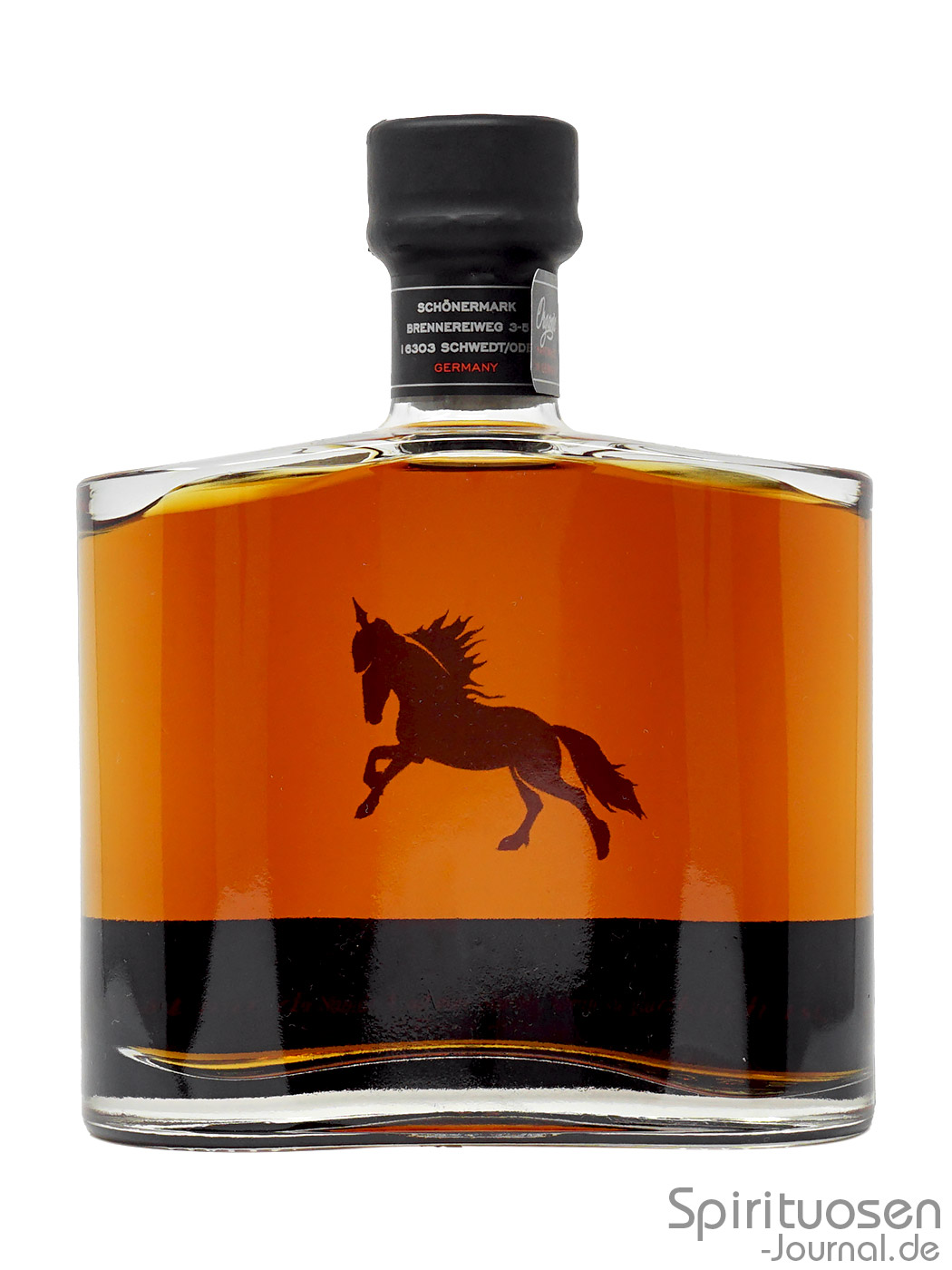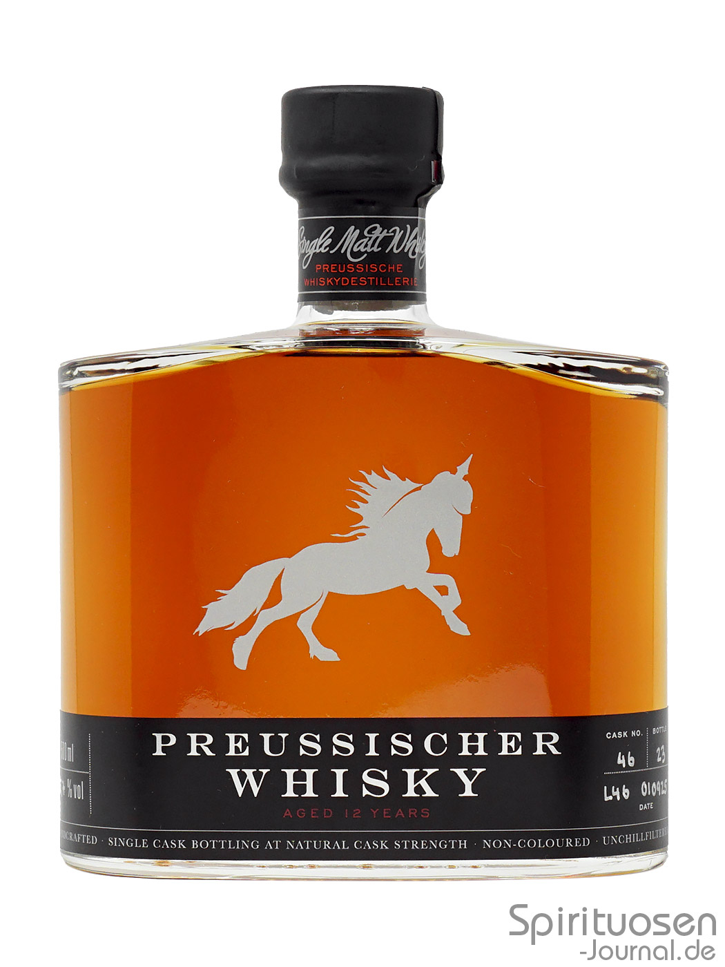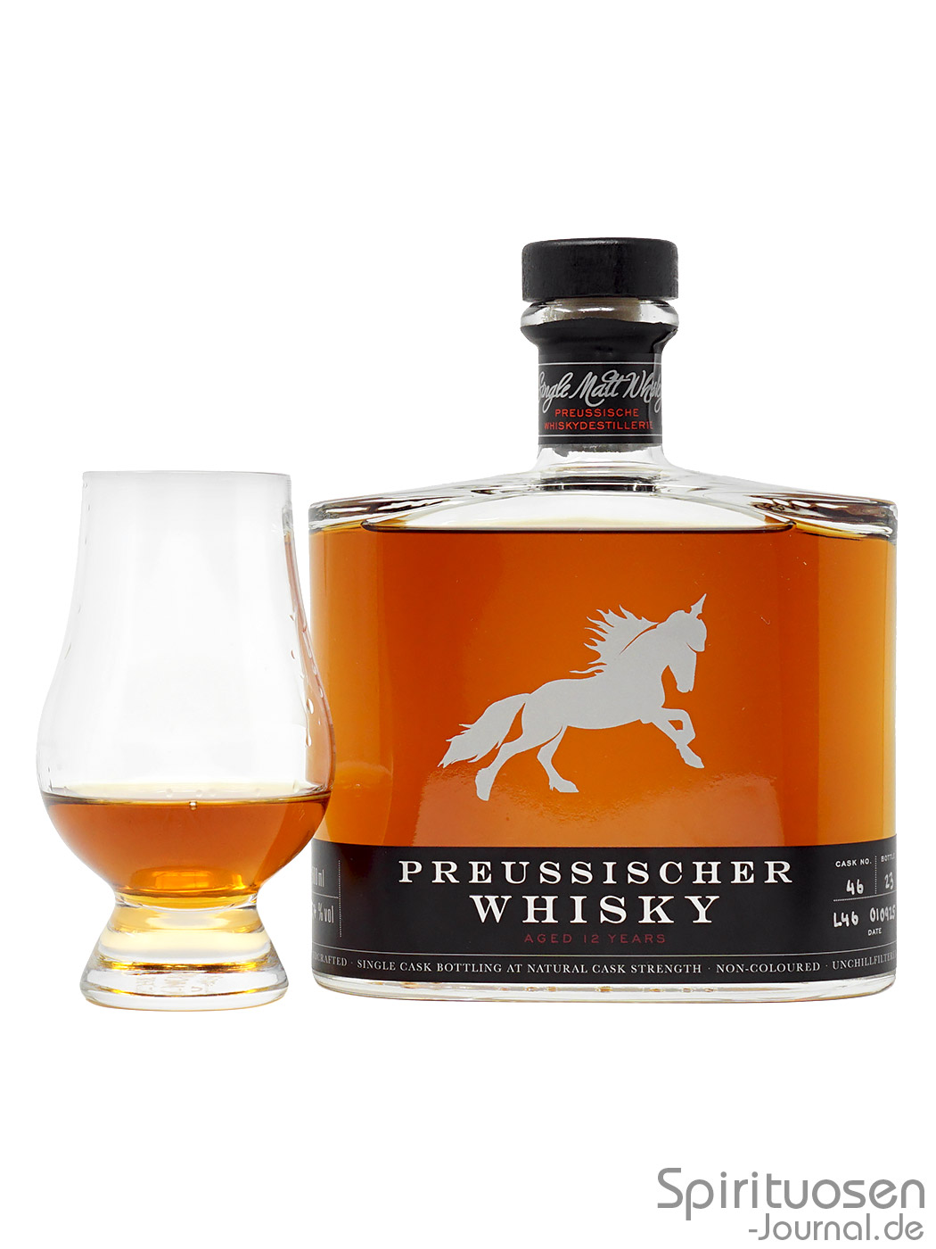 Erneut sieht man das Pferd auf der Vorderseite der Flasche als silberfarbenen Direktaufdruck auf dem Glas. Knapp oberhalb des Bodens befindet sich ein schwarzes Etikett, in dessen Mittelpunkt der silberfarben gehaltene Markenname und die rot wiedergegeben Altersangabe stehen. An den Seiten sind Angaben wie die Fass- sowie die Flaschennummer und das Abfülldatum händisch eingetragen.