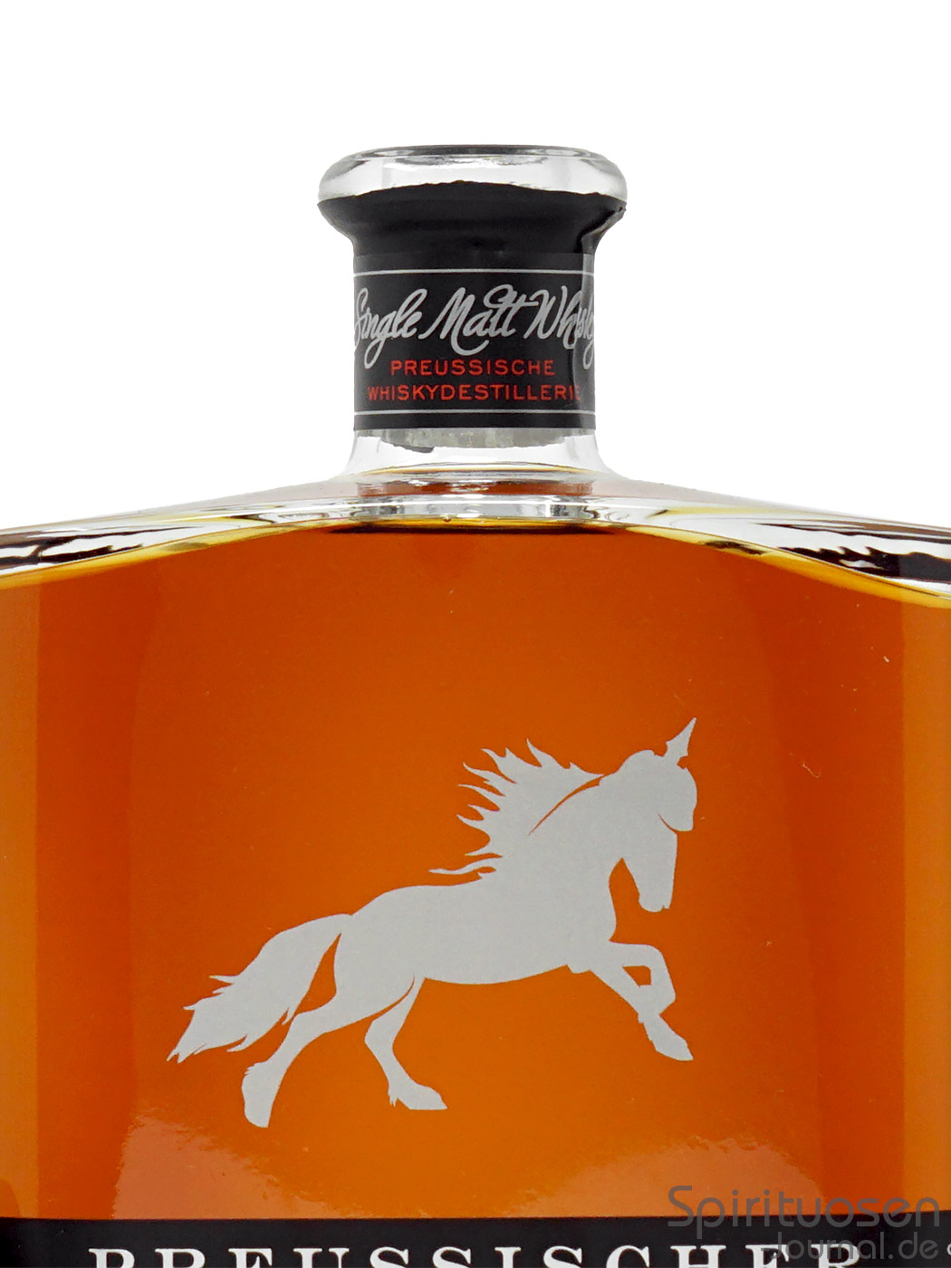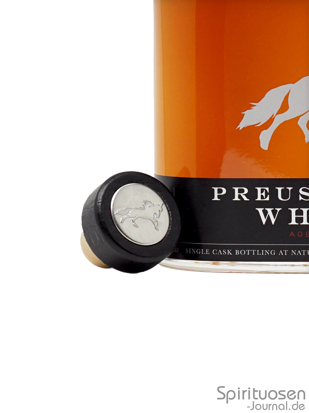 Als Verschluss findet man einen Kunstkorken vor. Dieser ist an einem schwarz eingefärbten Holzgriff befestigt. In den Griff eingelassen ist ein metallisches Emblem, das das Wappentier der Preussischen Whiskydestillerie, ein Pferd mit Pickelhaube, zeigt.