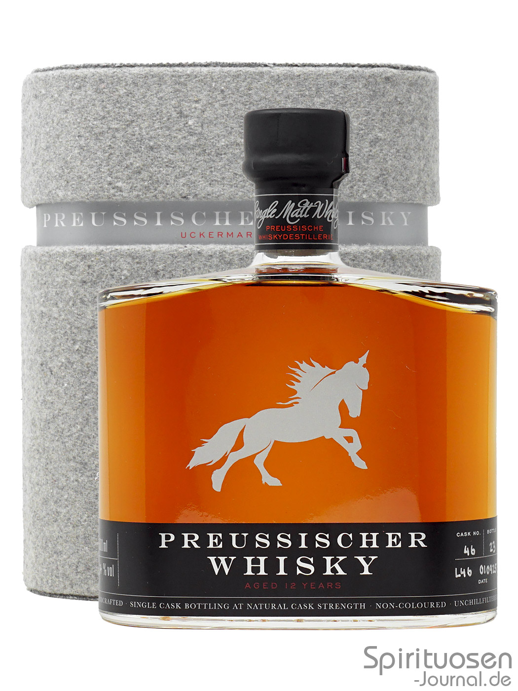 Die Preussischer Whisky 12 Jahre First Edition stellt die Erstveröffentlichung eines zwölfjährigen Single Malt Whiskys der Preussischen Whiskydestillerie in Schwedt in Brandenburg dar. Eine Vollreifung in Spessart-Eiche und eine hohe Fassstärke sorgen für geballte Kraft.