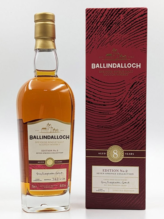 Die Ballindalloch Seven Springs Edition No. 2 ist ein Single Malt mit achtjähriger Reifung in einer Kombination aus Ex-Bourbon- und Ex-Sherry-Casks. Abgefüllt wurde naturbelassen mit einer Fassstärke von 60,6 Prozent. Entstanden sind 1200 Flaschen à 0,7 Liter. Die Ballindalloch Distillery verspricht rotbraune und goldene Farbtöne, reichhaltige Aromen von Schokolade und Orange sowie ein elegantes, würziges Finale.