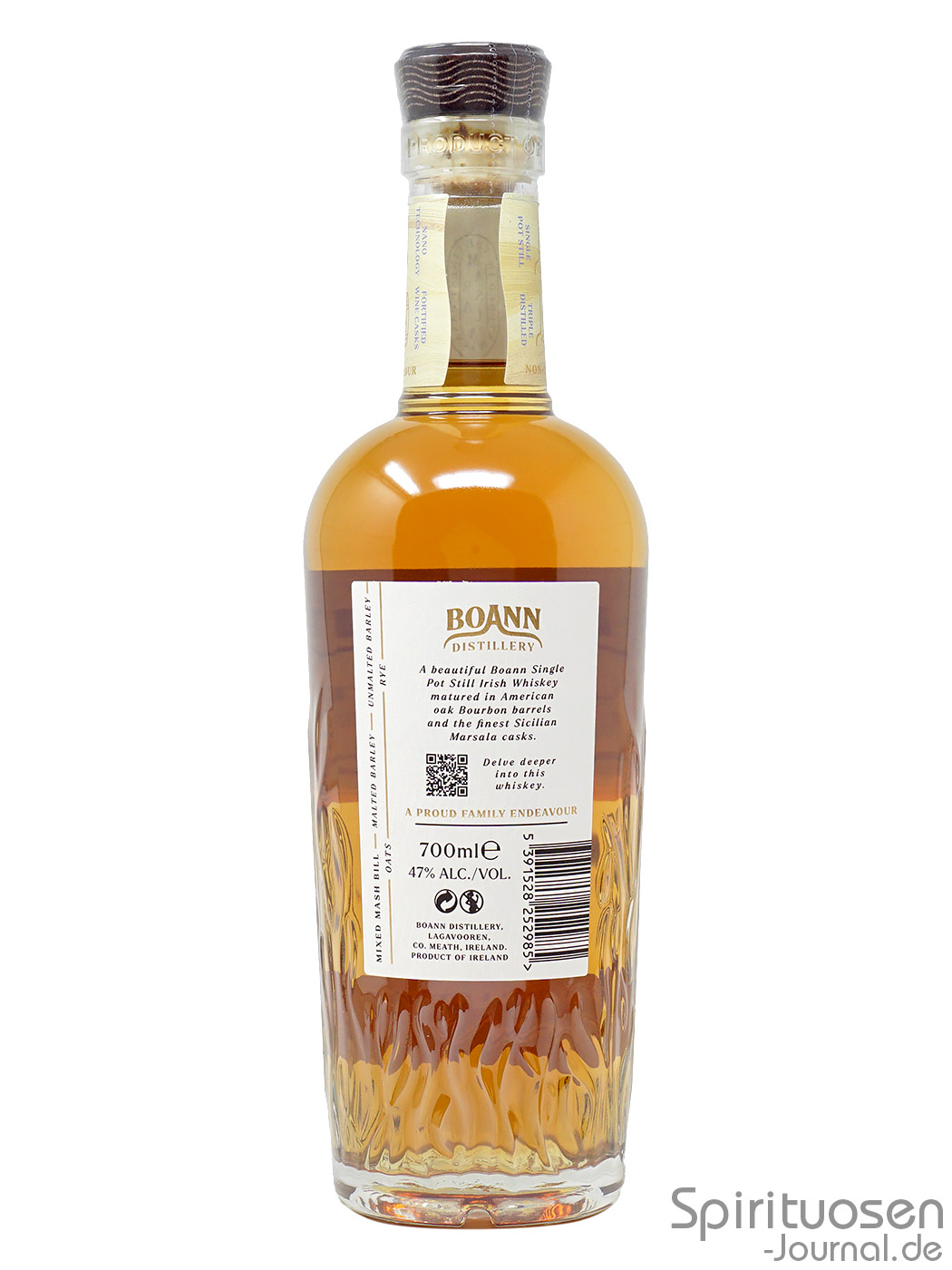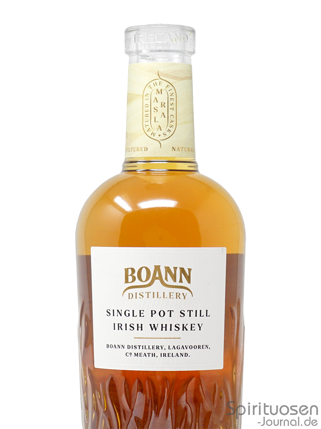 Zu haben ist der gold- bis bernsteinfarbene Boann Single Pot Still Marsala Cask in einer eher hohen Flasche aus Weißglas. Der ebenfalls eher hohe Körper, den ein an Getreidehalme erinnerndes Muster im Glas prägt, läuft leicht konisch zu einem etwas dickeren Sockel zusammen. Am anderen Ende sind rundliche Schultern, die den Korpus mit einem mittellangen Hals verbinden. Jenen Hals umgibt eine sandfarbene Banderole, versehen mit Eigenschaften des Whiskeys wie der auch der Reifung. Final mündet der Hals in einer großen Lippe.