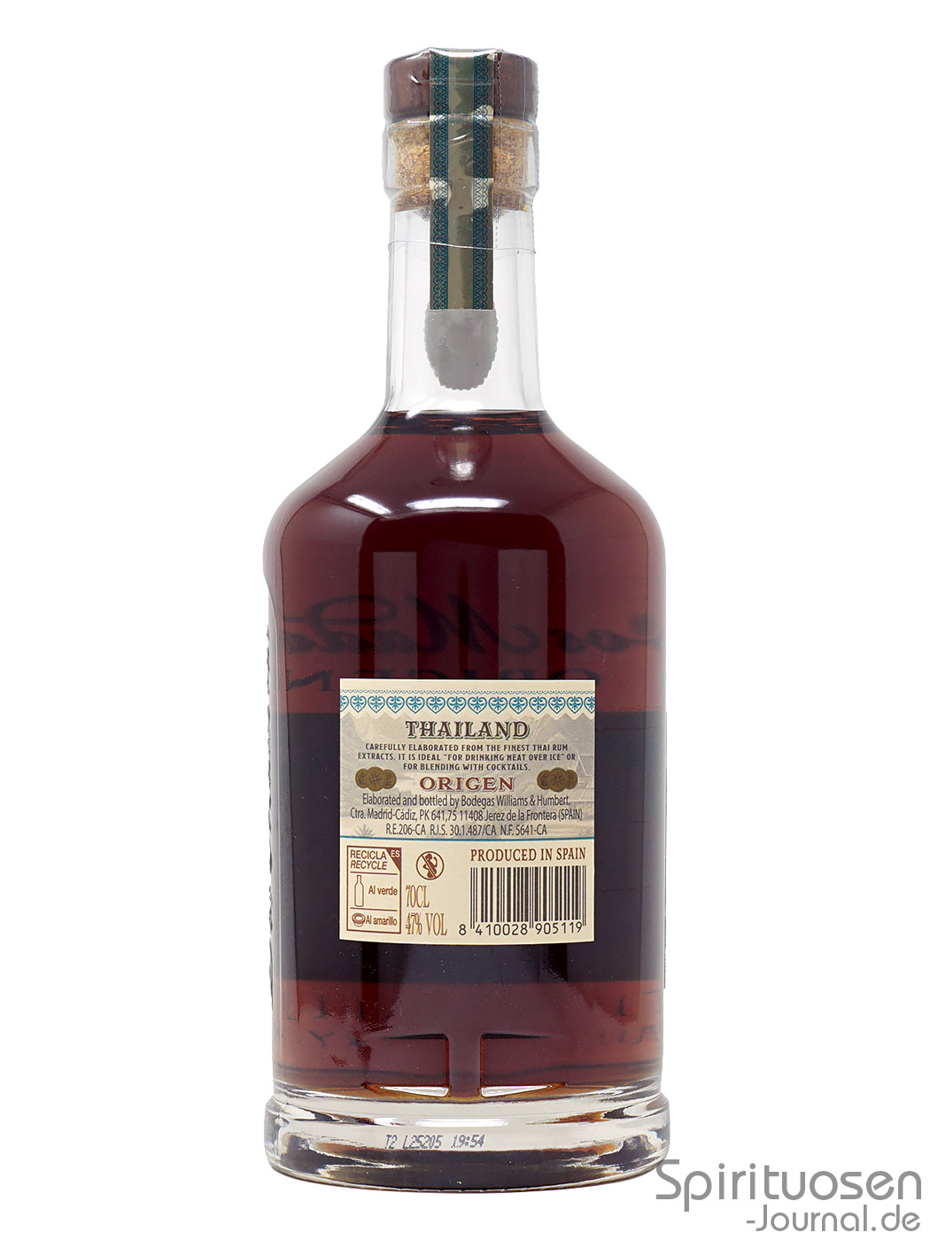 Mit dem Dos Maderas Origen Thailand 12 Jahre haben die Bodegas Williams & Humbert im andalusischen Jerez de la Frontera im Herbst 2025 die Origen Series, die Rums aus ausgewählten Herkunftsländern mit einer Nachreifung in originalen Ex-Sherry-Casks kombinieren soll, eingeläutet. Für den Erstling holte Williams & Humbert einen Rum aus der zu ThaiBev gehörenden SangSom Distillery in der thailändischen Provinz Nakhon Pathom – bekannt ist die Brennerei für den Phraya Rum. Destilliert wurde auf einer Column Still auf Grundlage von Zuckerrohrmelasse. Bereits vor Ort erfolgte eine zwölfjährige Reifung in Ex-Bourbon-Casks in kühlen Kellern unweit einer Lagune in dem ansonsten tropischen Klima Thailands. Angekommen in Jerez, sorgte man für eine Nachreifung über einen unbekannten Zeitraum in 80 Jahre genutzten Ex-Oloroso-Sherry-Casks aus eigenem Hause. Schlussendlich abgefüllt wurde mit einem Alkoholvolumen von 47 Prozent und frei von Zusätzen. Es entstanden 4000 Flaschen à 0,7 Liter, davon 750 für Deutschland. Mehr Informationen zur Marke und Destillerie der getesteten Spirituose sind auf der Dos-Maderas-Übersichtsseite zu finden.
