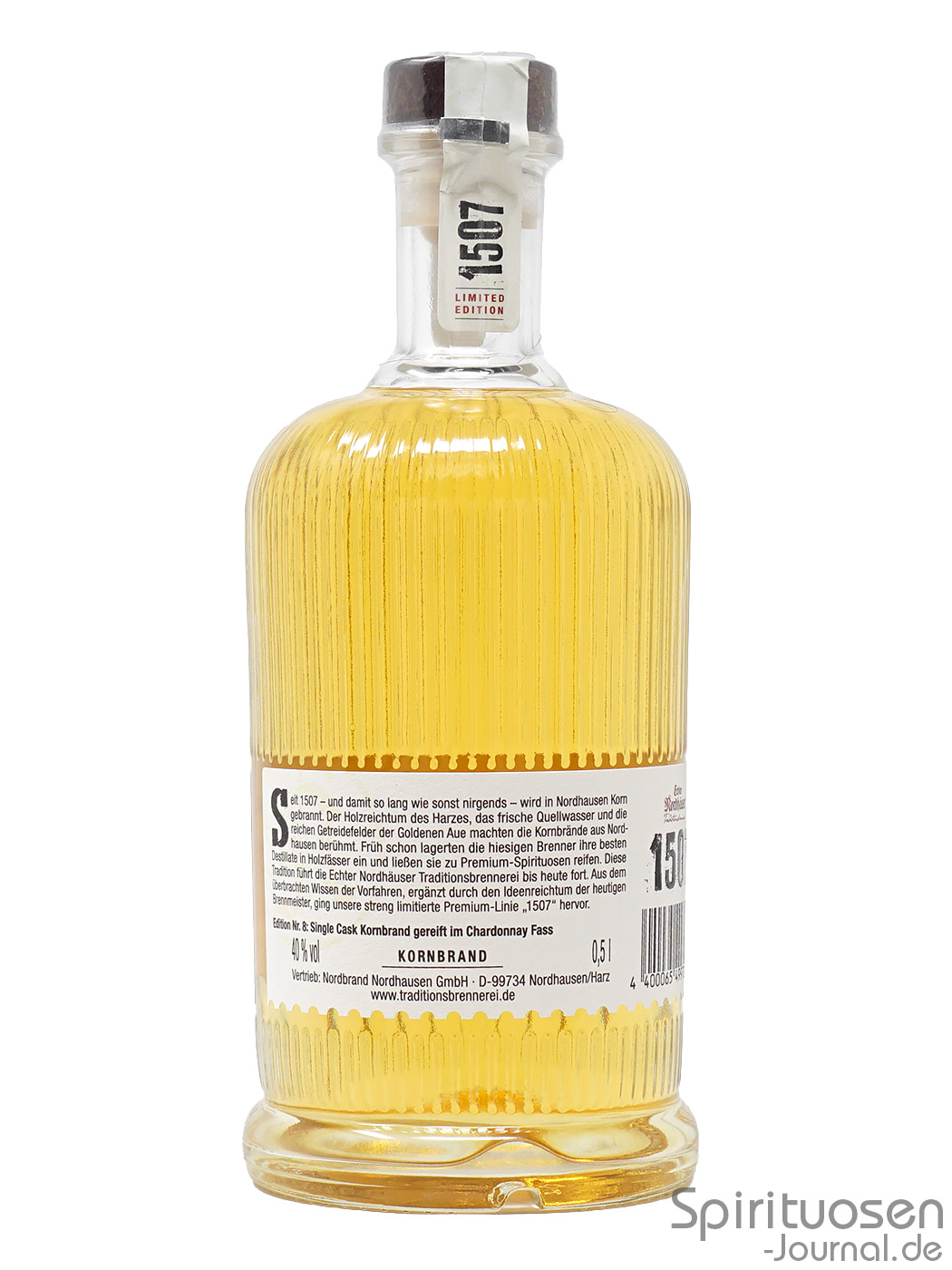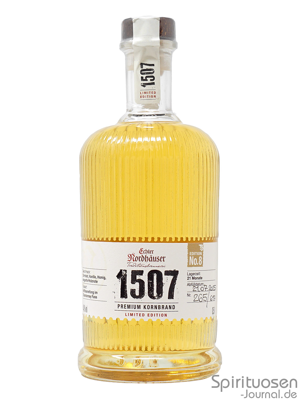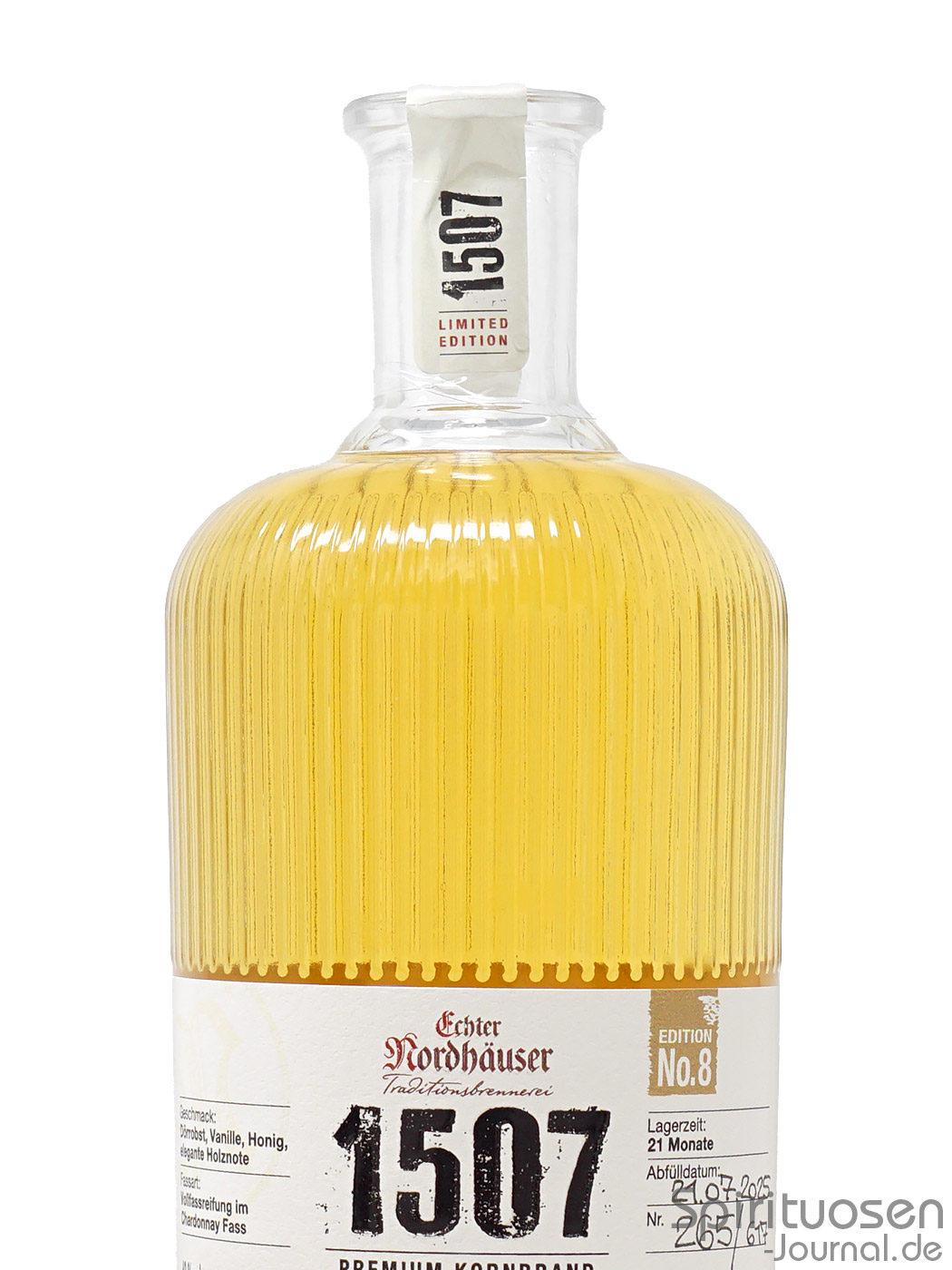 Am 23. September 2025 launchte die Echter Nordhäuser Traditionsbrennerei im thüringischen Nordhausen die Edition No. 8 ihrer „1507“-Serie. Es handelt sich dabei um einen Roggenkornbrand, der auf kupfernen Rohbrand- und Feinbrandkolonnen aus einer aus Roggen bestehender Maische gewonnen wurde. Anschließend durfte das Destillat für 21 Monate in einem einzelnen Ex-Chardonnay-Cask aus französischer Eiche reifen. Abgefüllt wurde am 21. Juli 2025 mit einem Alkoholvolumen von 40 Prozent und ohne Zusätze. Dem Einzelfass konnten 617 Flaschen à 0,5 Liter entlockt werden. Mehr Informationen zur Marke und Destillerie der getesteten Spirituose sind auf der Echter-Nordhäuser-Übersichtsseite zu finden.