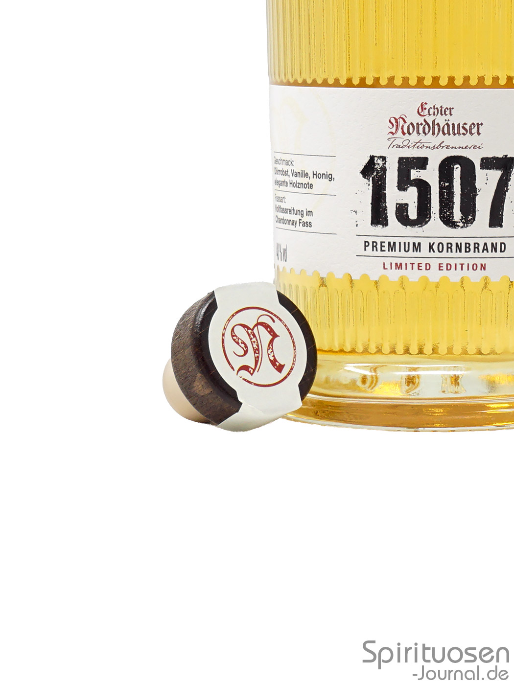 Verschlossen wird die Flasche von einem hellen Kunstkorken. Dieser ist befestigt an einem dunklen Holzgriff, der mit einem weißen Papierstreifen, auf dem die Initiale „N“ für Nordhäuser steht, beklebt ist. Die Enden des Streifen führen wie eine Art Siegel über den Flaschenhals.