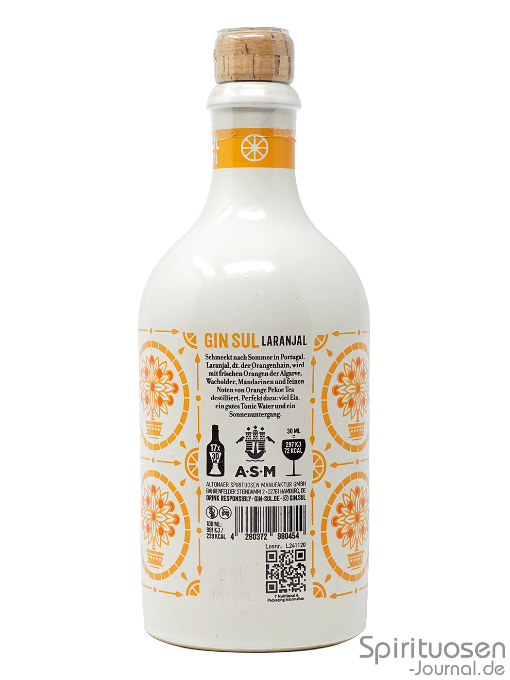 Den klaren Gin Sul Laranjal gibt die Altonaer Spirituosen Manufaktur in die markentypische Steinzeugflasche in Weiß. Die recht kompakte Flasche verfügt über einen zylindrischen Körper, eher langgezogene Schultern und einen mittellangen Hals, an dessen Ende eine kleine Lippe ist.