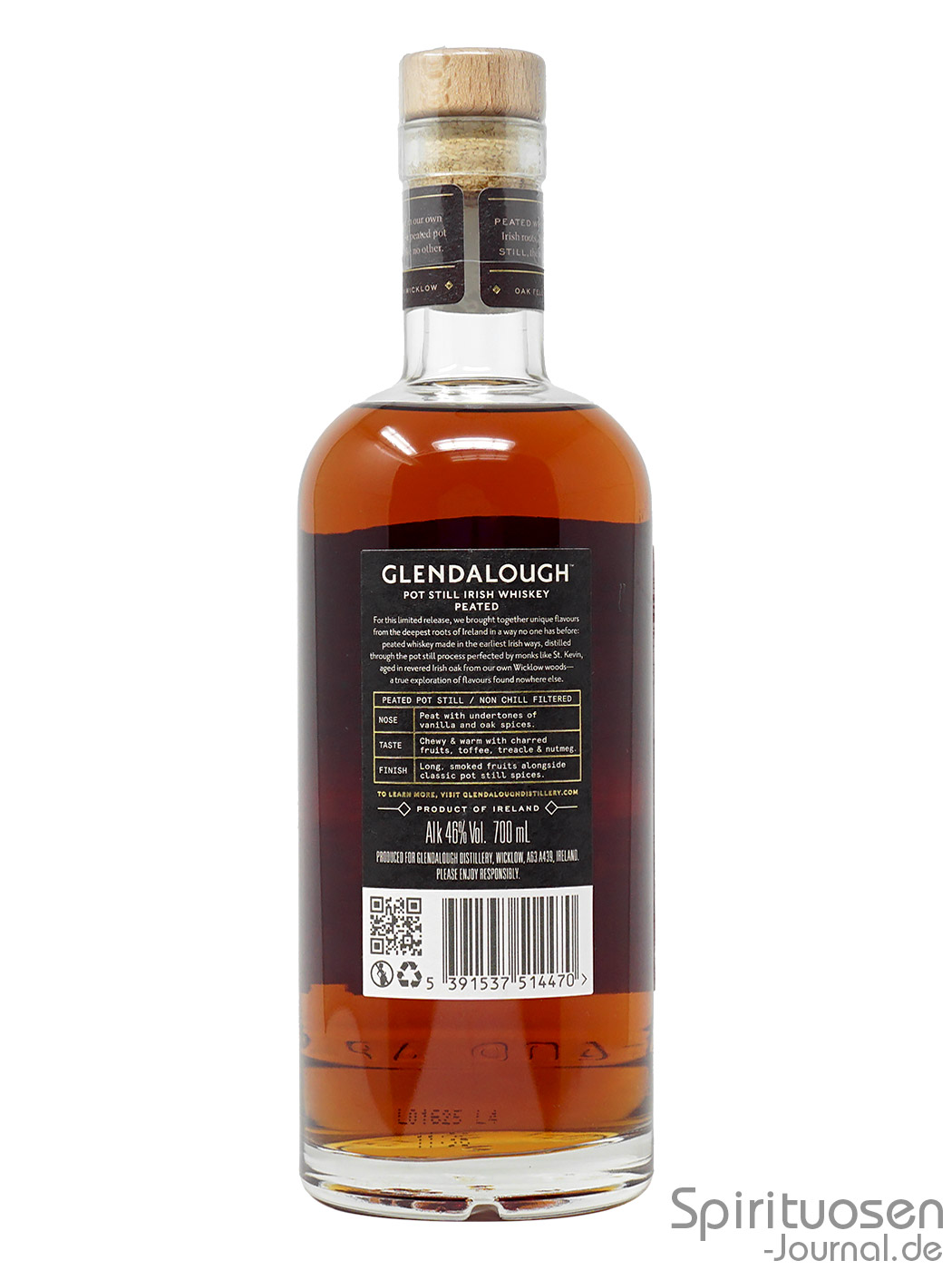 Die Glendalough Distillery im irischen County Wicklow veröffentlichte im Frühling 2025 den Glendalough Pot Still Peated als Limited Edition. Dabei handelt es sich um einen seltenen, da getorften Pot Still Irish Whiskey. Für die Herstellung arbeitete man mit einer oder mehreren namentlich nicht genannten Brennereien in Irland zusammen. Destilliert wurde im Zuge einer unbekannten Anzahl an Durchläufen auf Kupferbrennblasen auf Grundlage einer Mashbill aus zwei Teilen ungemälzter und einem Teil gemälzter Gerste. Der Anteil gemälzter Gerste war in unbekannter Höhe getorft. Zunächst nahm man eine dreijährige Reifung in Ex-Bourbon-Casks vor. Darauf folgte eine vierjährige Reifung in Virgin-Irish-Oak-Casks – für diese werden jeden Winter seltene 140 Jahre alte Eichen in den Wicklow Mountains nachhaltig gefällt, das Holz ein Jahr an der Luft getrocknet und schließlich zu Hogsheads verarbeitet. Das Abfüllen in Flaschen geschah mit einem Alkoholvolumen von 46 Prozent, ohne Kältefiltration und ohne Farbstoff. Der Umfang der Limitierung verbleibt im Dunkeln. Mehr Informationen zur Marke und Destillerie der getesteten Spirituose sind auf der Glendalough-Übersichtsseite zu finden.