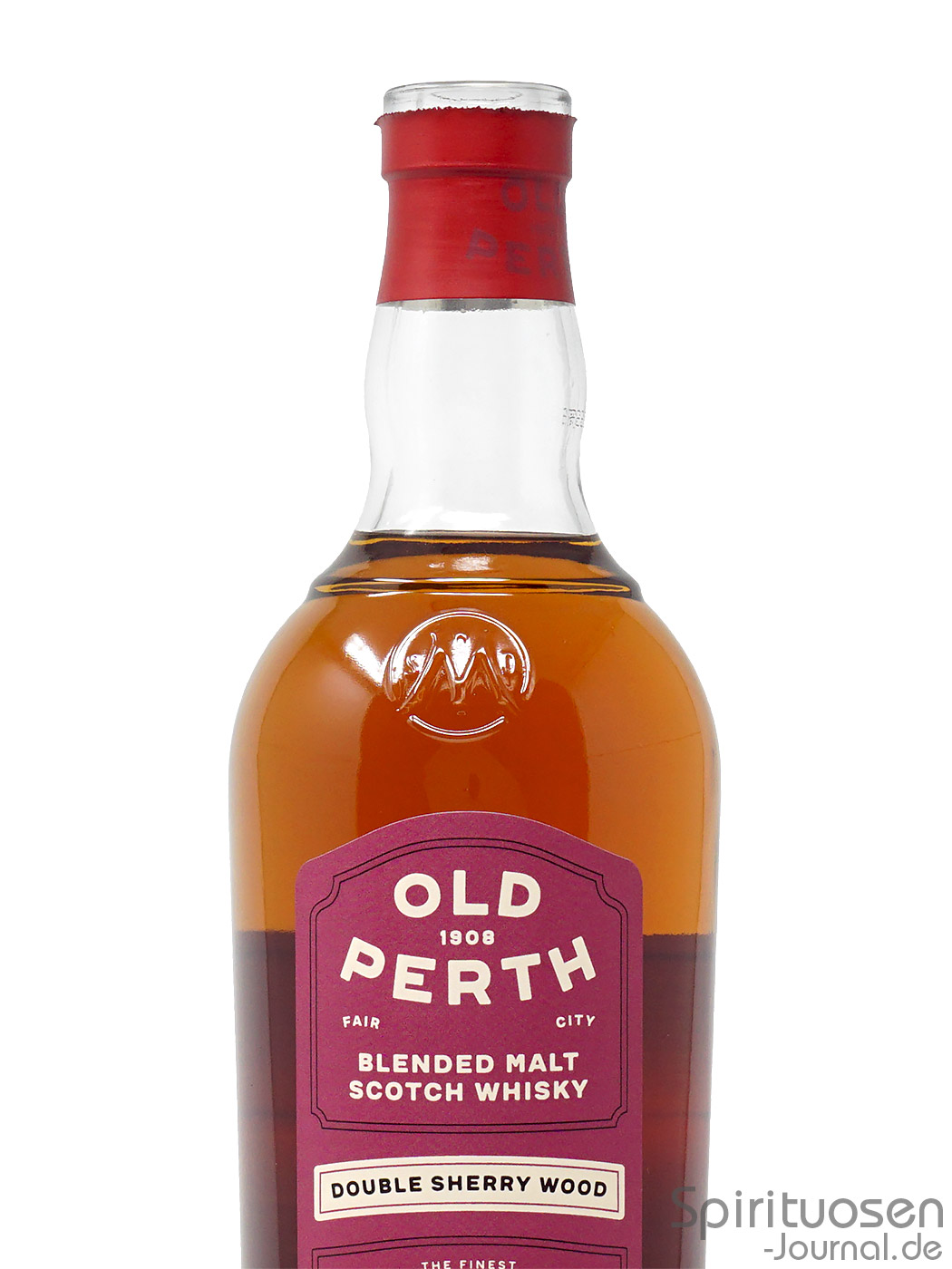 Den bernsteinfarbenen Old Perth Double Sherry Wood gibt es einer recht hohen Flasche aus Weißglas. Der konische Körper läuft leicht in Richtung des recht massigen Sockels zusammen. Rundlich bis steile Schultern führen derweil zu einem mittellangen Hals, den Bestandteile einer roten Schrumpfkapsel mit aufgedrucktem Markennamen umgibt.