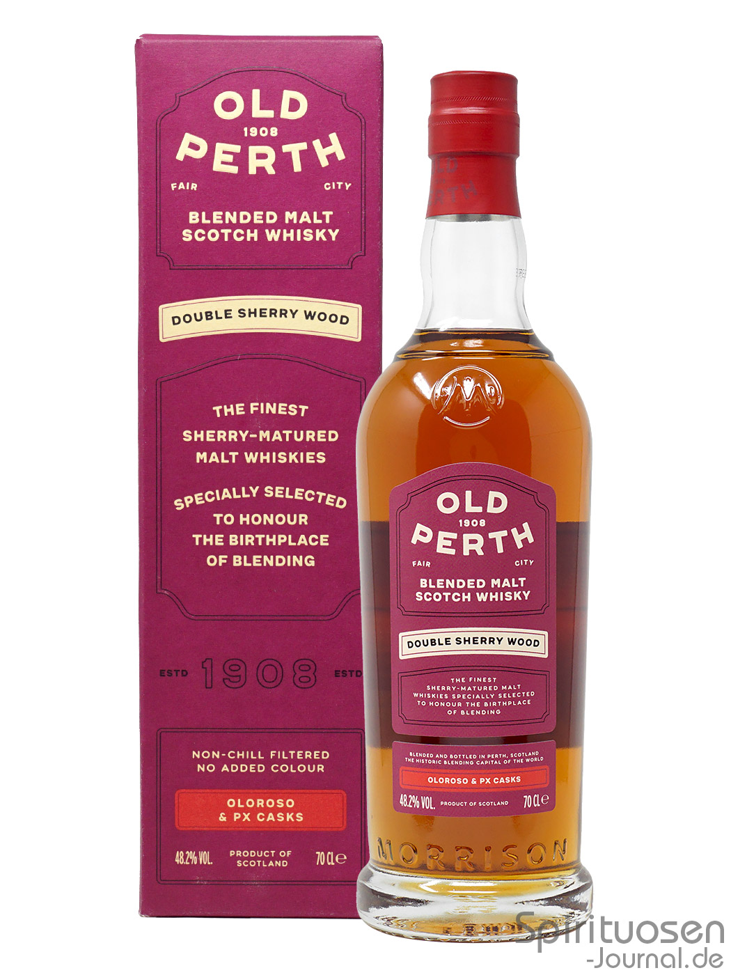 Beim Old Perth Double Sherry Wood, gelauncht im Spätsommer 2024, handelt es sich um eine Kernqualität der zu den Morrison Scotch Whisky Distillers gehörenden Marke Old Perth. Dieser Blended Malt Scotch Whisky besteht aus Single Malts namentlich nicht genannter Brennereien. Im Vergleich zu den übrigen Kernqualitäten der Marke soll der Fokus verstärkt auf First-Fill-Pedro-Ximénez-Sherry-Butts und Hogsheads liegen, die zu 25 Prozent vertreten sind. Weitere Bestandteile reifen zu 25 Prozent in First-Fill-Oloroso-Sherry-Butts und Hogsheads sowie zu 50 Prozent in Refill-Oloroso-Sherry-Butts. Eine Altersangabe existiert nicht. Abgefüllt wird mit einem Alkoholgehalt von 48,2 Prozent, ohne Kältefiltration und ohne Farbstoff. Mehr Informationen zur Marke und Destillerie der getesteten Spirituose sind auf der Old-Perth-Übersichtsseite zu finden.