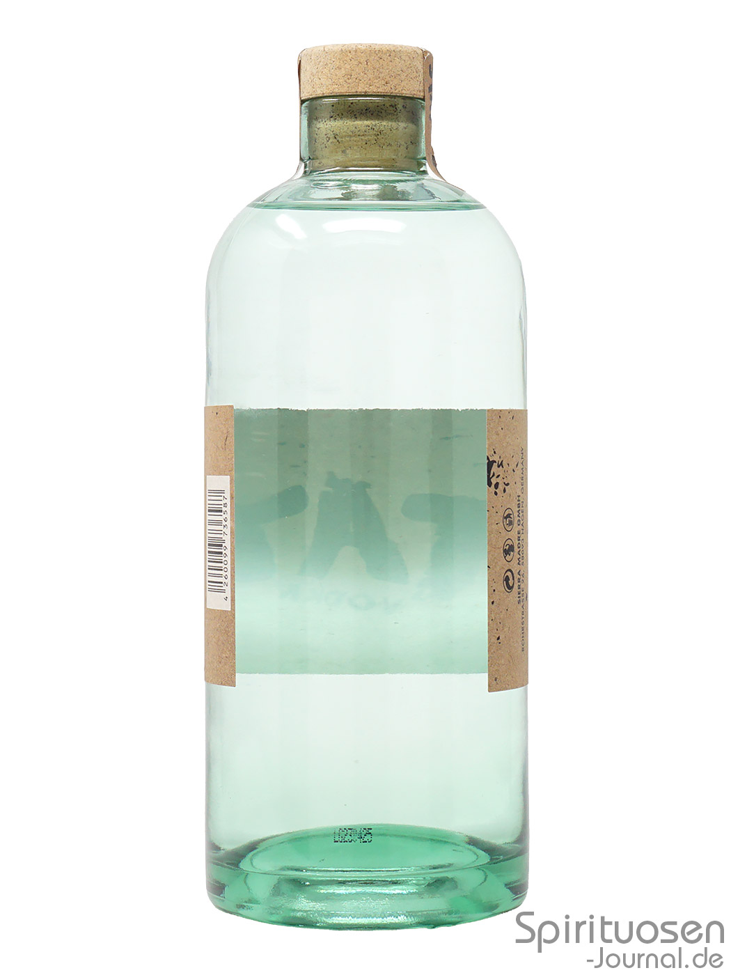 Als Verschluss fungiert ein kompostierbarer Naturkorken, dessen Griff selbst auch aus Kork besteht. Über den Verschluss bis zu den Schultern verläuft ein brauner Papierstreifen vollständig aus Recyclingfasern, bedruckt mit dem Markennamen in Schwarz und einem Fingerabdruck in Türkis.