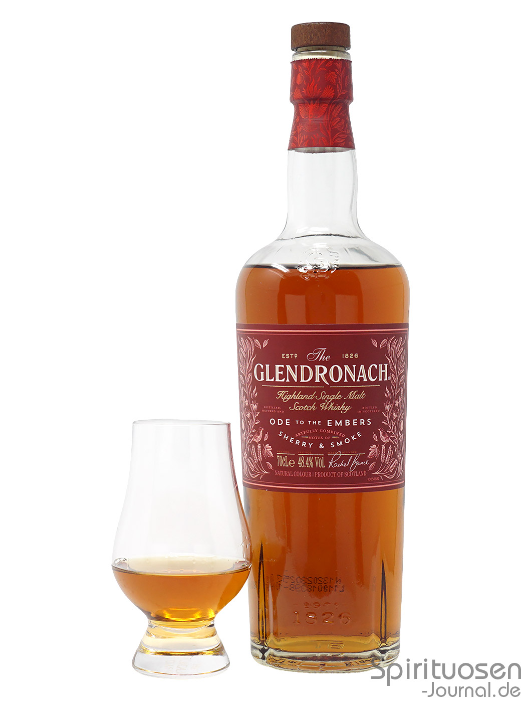 Zu haben ist der kupferfarbene The Glendronach Ode to the Embers in einer hohen Weißglasflasche. Der hohe, zylindrische Körper verjüngt sich leicht zum Sockel hin. Am anderen Ende führen rundliche Schultern zu einem langen, leicht bauchigen Hals. Den Hals umgeben Teile einer Schrumpfkapsel in Rot.