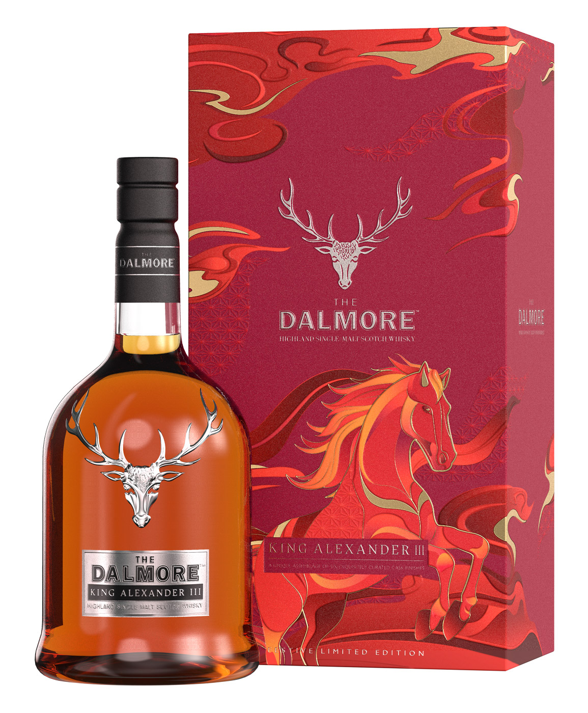 Jene Single Malt Scotch Whiskys, welche die The Dalmore Distillery in den schottischen Highlands in die limitierten Geschenkhüllen gepackt hat, sind der The Dalmore 18 Jahre und der The Dalmore King Alexander III. Sowohl die Flaschen als auch die Single Malts selbst sind unverändert geblieben. Derweil erstrahlen die Geschenkhüllen in feurigen Rottönen, dazu zieren sie Illustrationen des „Feuerpferds“, in dessen Zeichen das chinesische Mondjahr 2026 steht.